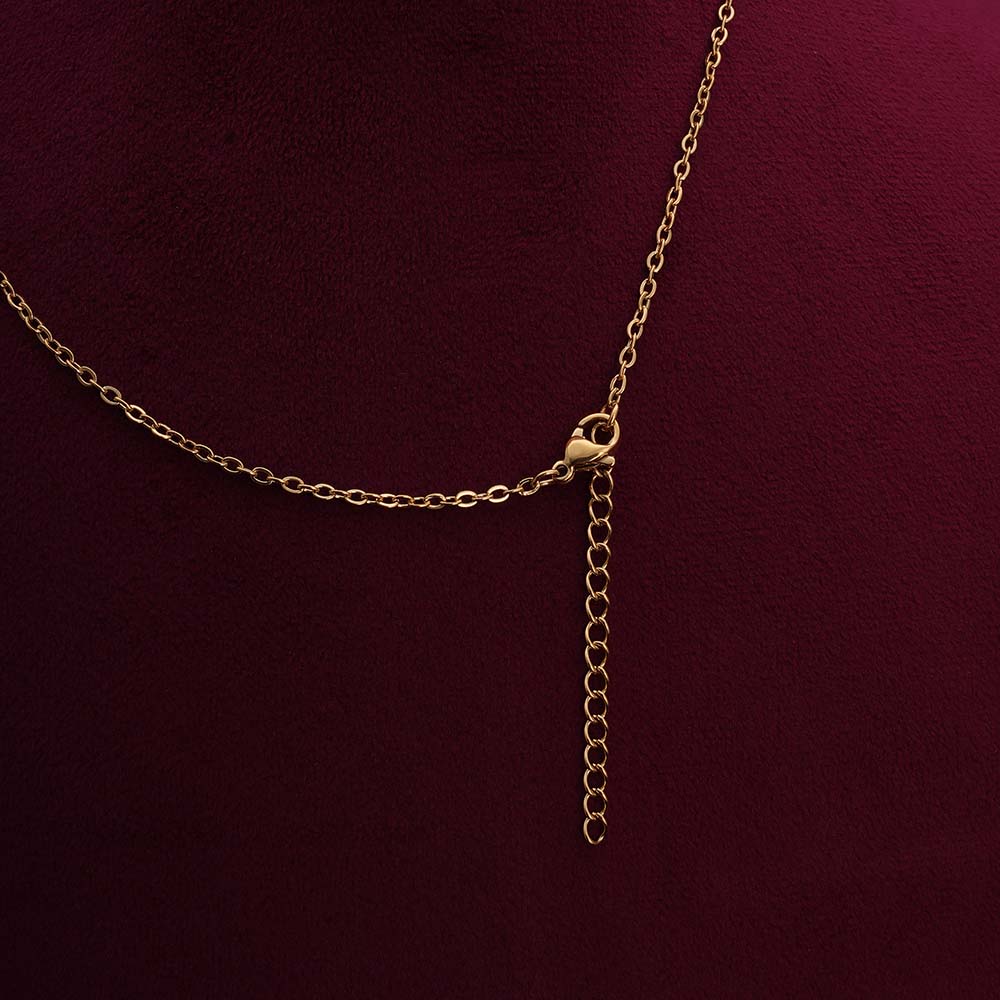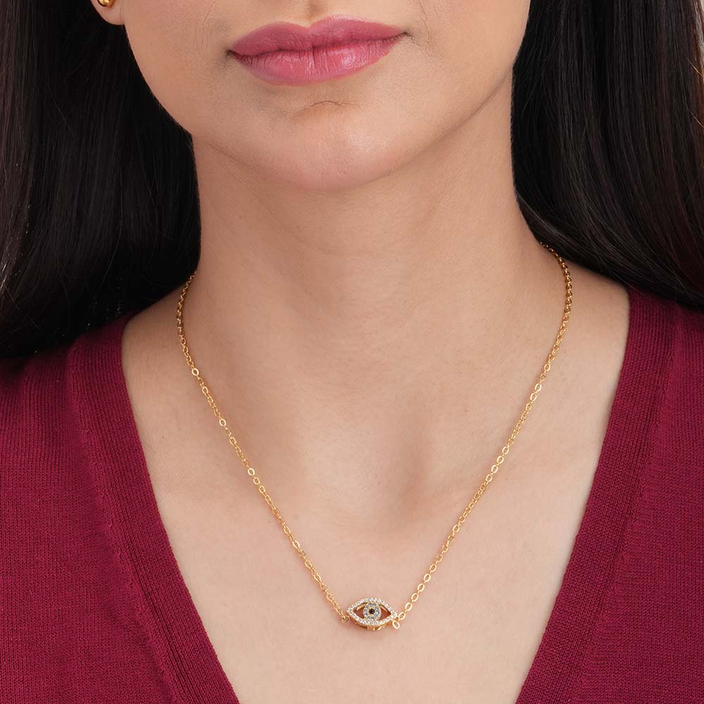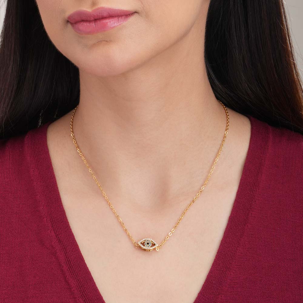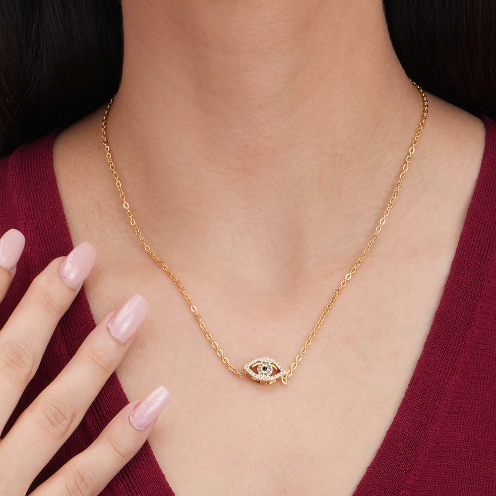 The Evil Eye Elegance Gold Necklace blends protection with style in a contemporary design. Crafted in 18k gold-plated stainless steel, its blue and white cubic zirconia pendant symbolizes good luck and positive energy. Perfect for layering or wearing solo, this necklace adds a striking yet subtle charm to casual outfits and evening ensembles, making it a versatile, meaningful jewellery piece.