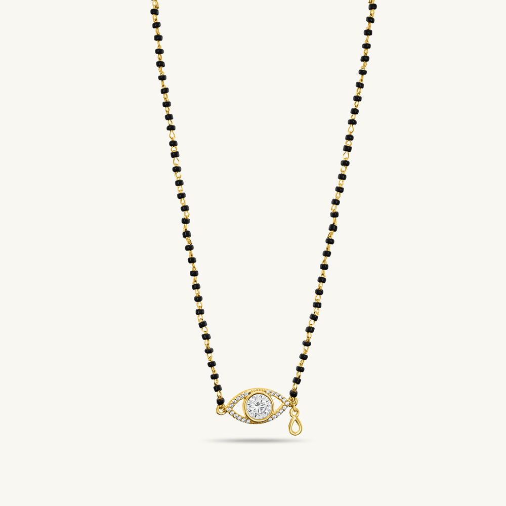 Elegance meets protection in our Evil Eye Mangalsutra. Crafted with sterling silver, this exquisite piece blends tradition with contemporary charm. The evil eye pendant, believed to ward off negativity, adds a touch of mystique to this timeless symbol of marital bliss. Embrace style and spirituality in one with our uniquely designed mangalsutra