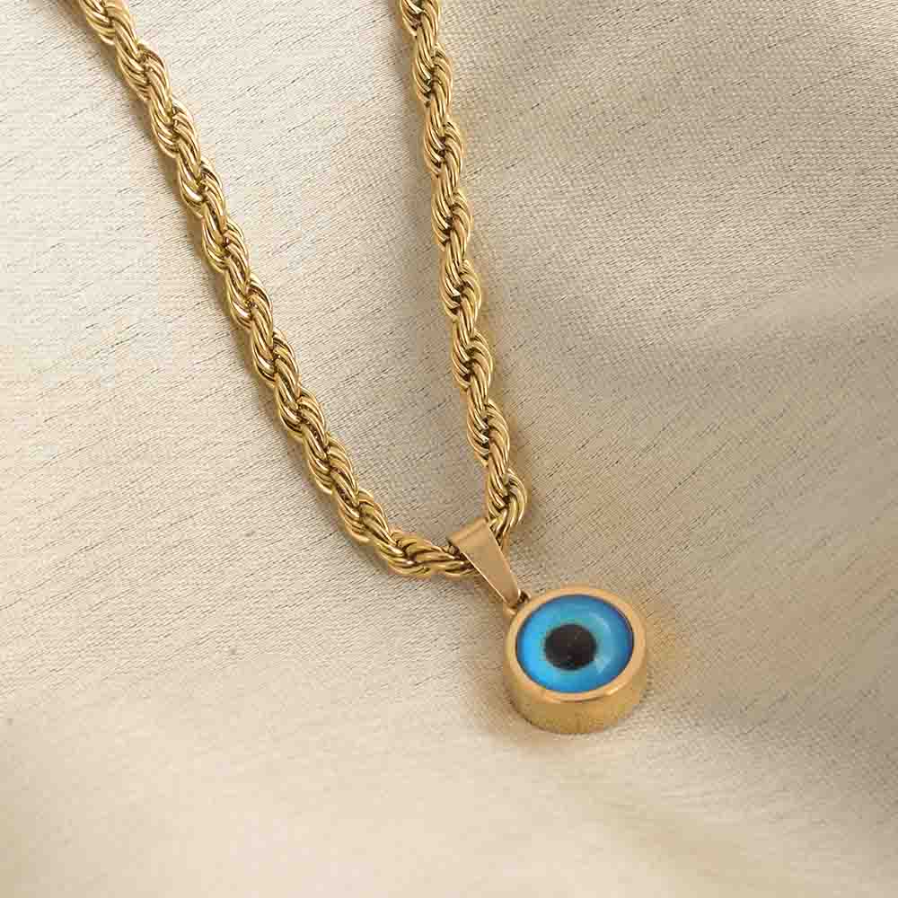 Protective, stylish, and modern, the Evil-Eye Spiral Necklace is crafted in stainless steel, featuring a striking blue evil-eye bead set within a spiral pendant. Symbolizing protection and good fortune, this necklace adds both meaning and style to any outfit. Perfect for everyday wear or as a statement piece, it effortlessly blends contemporary design with symbolic charm.