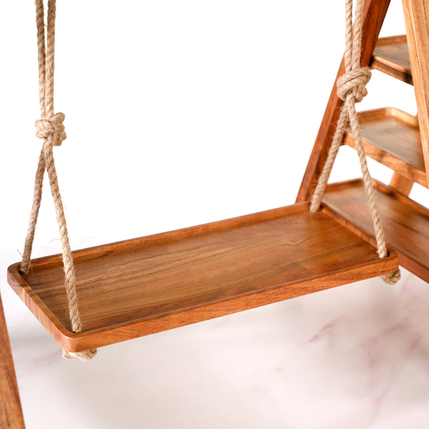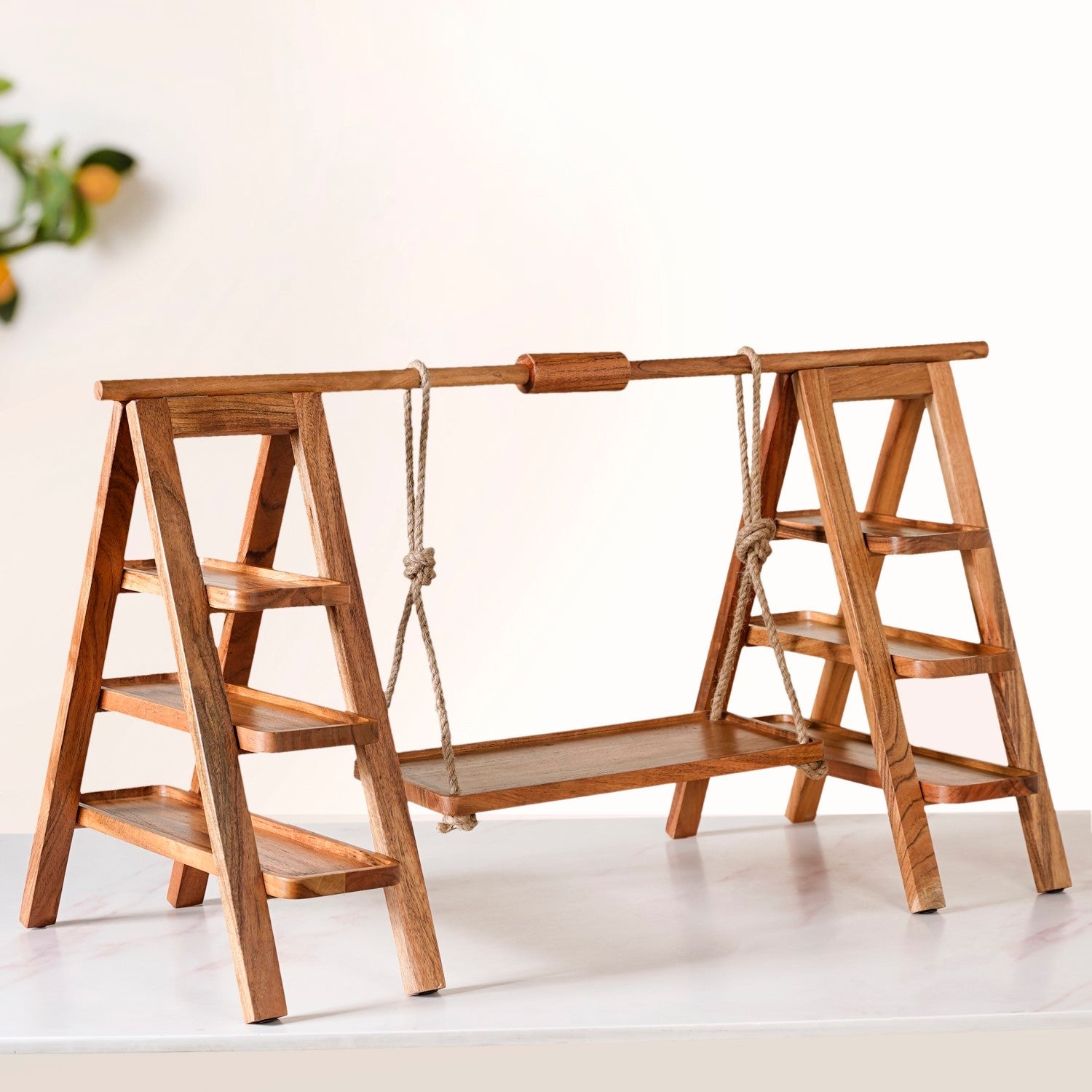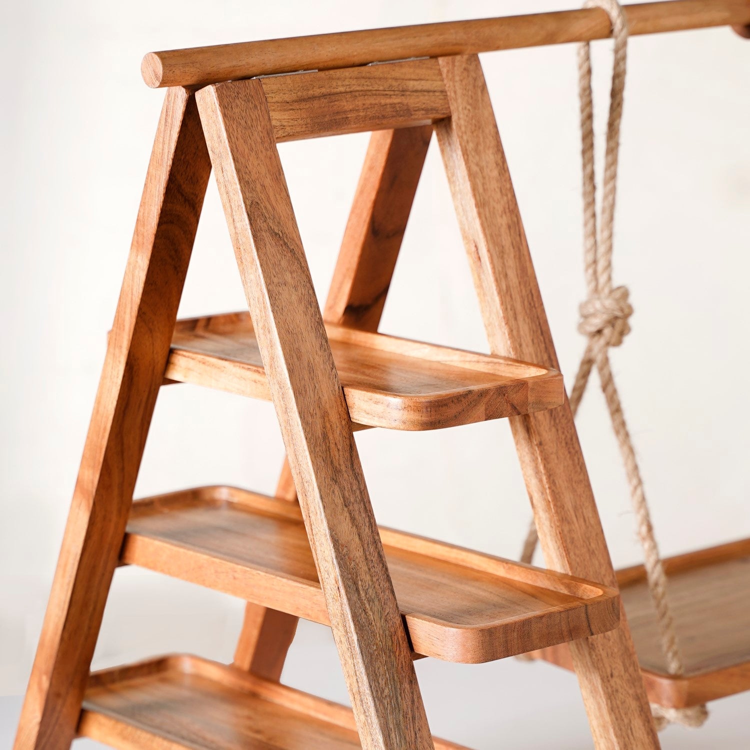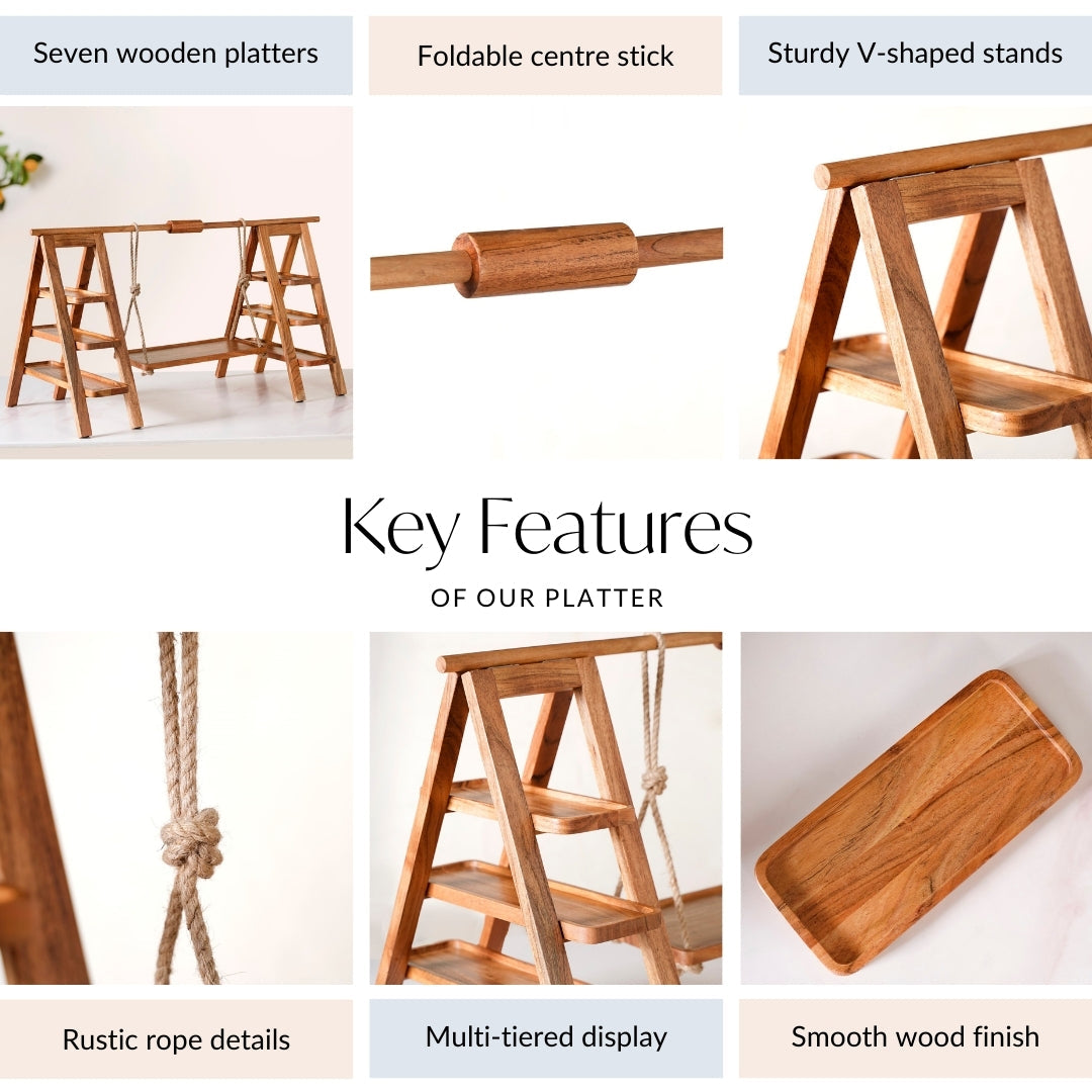 Design: Crafted from durable acacia wood, this multi-tier serving platter stand features seven wooden platters supported by two triangular stands. A foldable central stick ensures secure assembly, while rope accents lend rustic detailing. The smooth, polished surface highlights natural wood grains, and the balanced multi-level design allows desserts to be displayed neatly. Portable and compact, it is ideal for buffets, parties, and family gatherings.