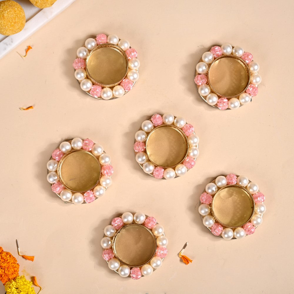 Faux Pearl Bordered Candle Holders With Pink Beads Set Of 6