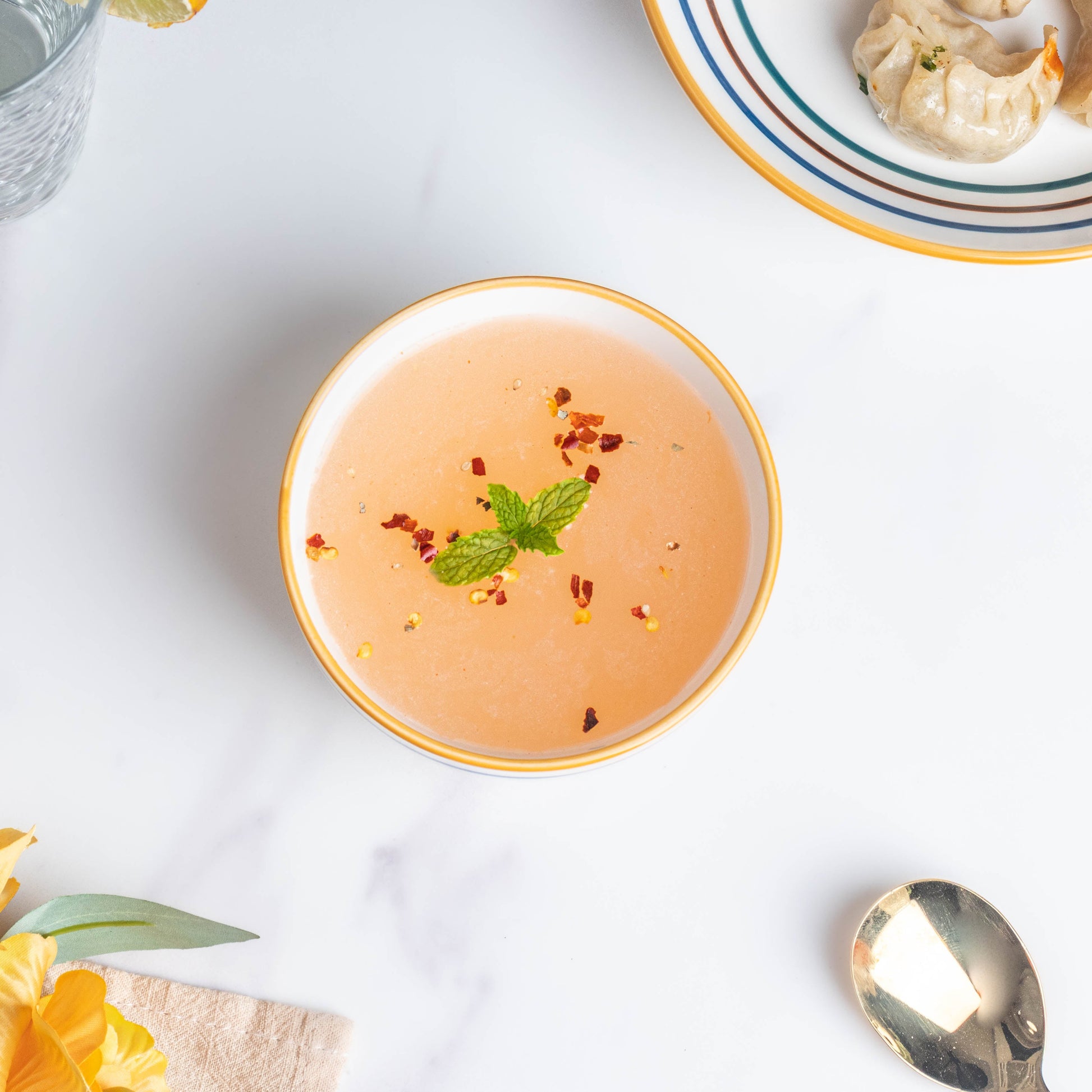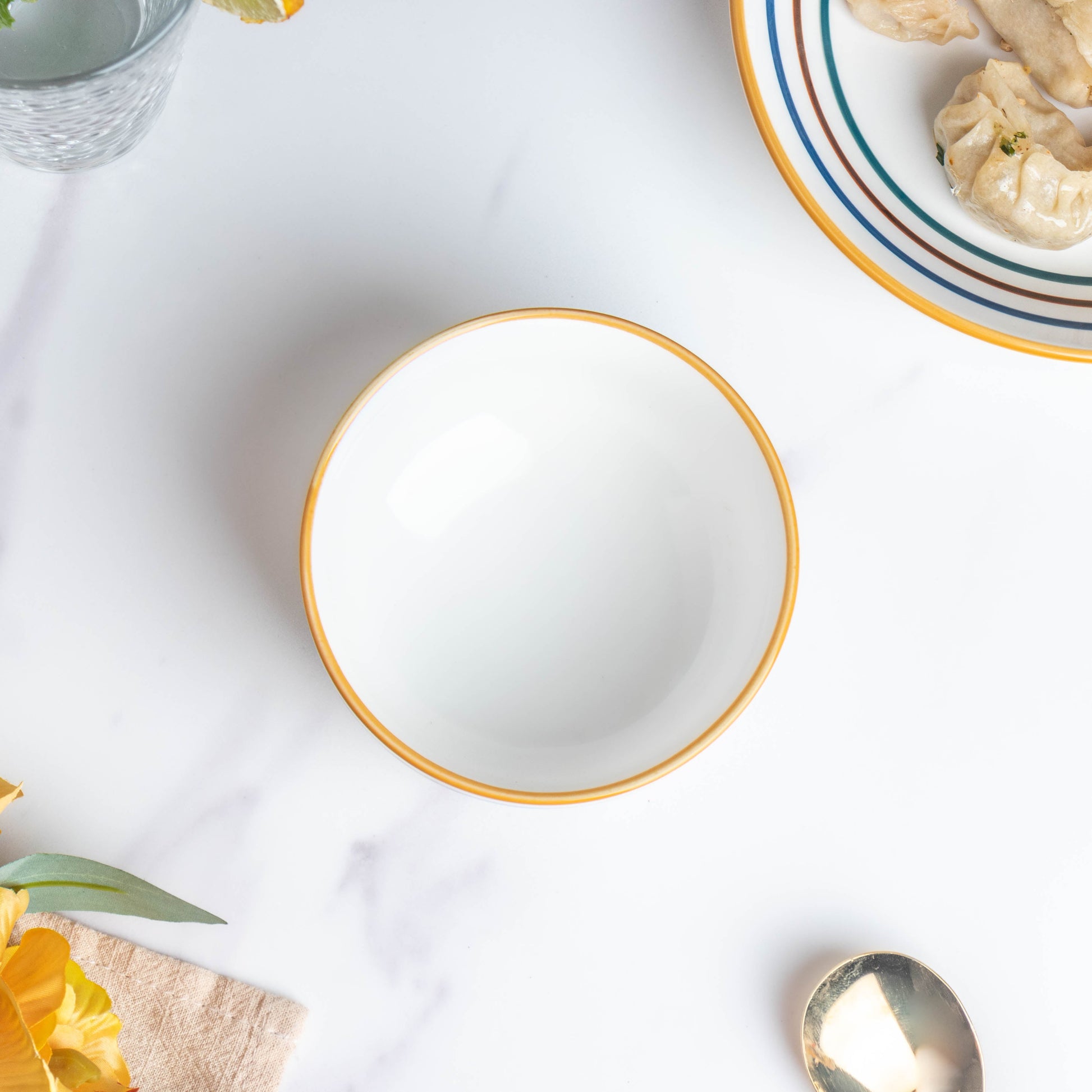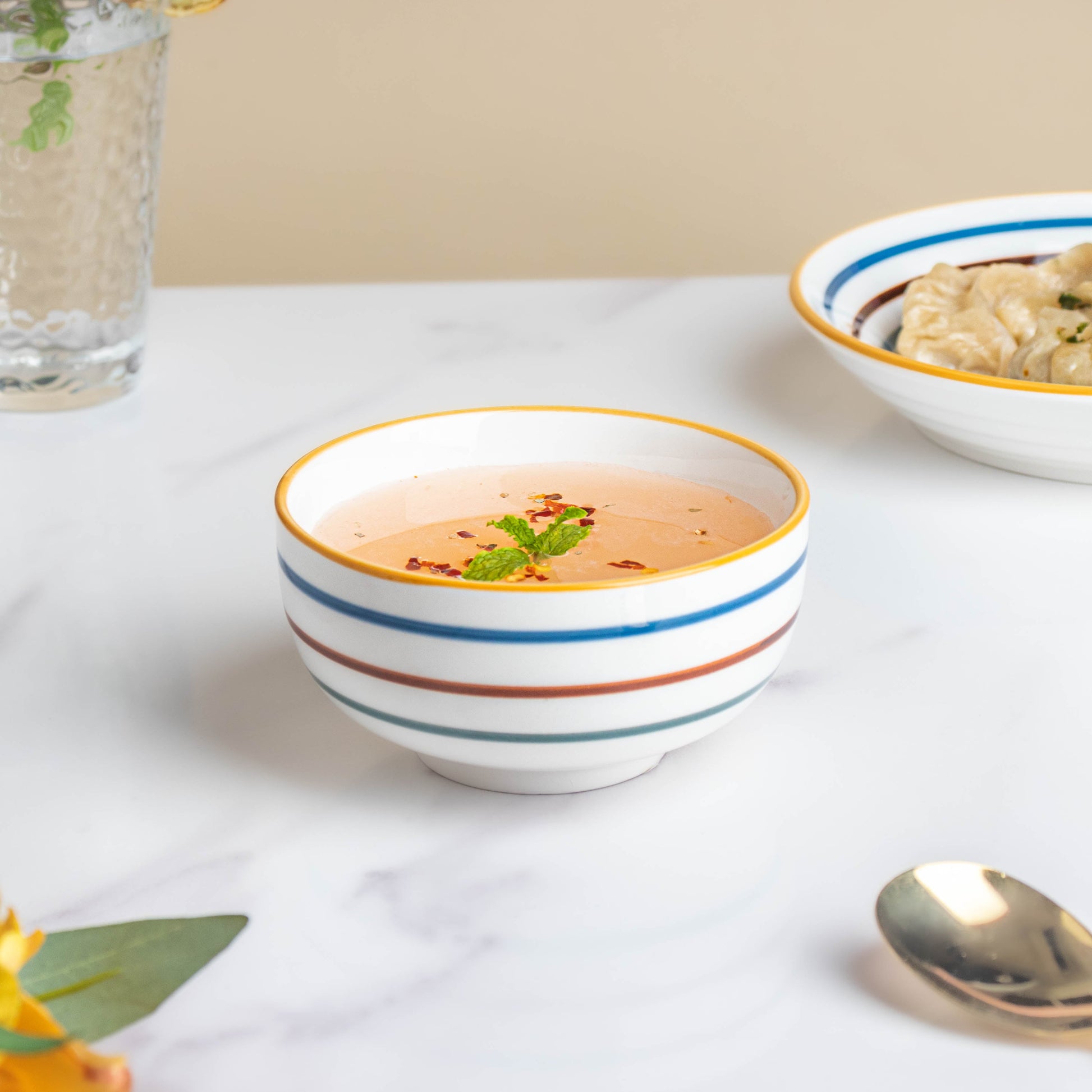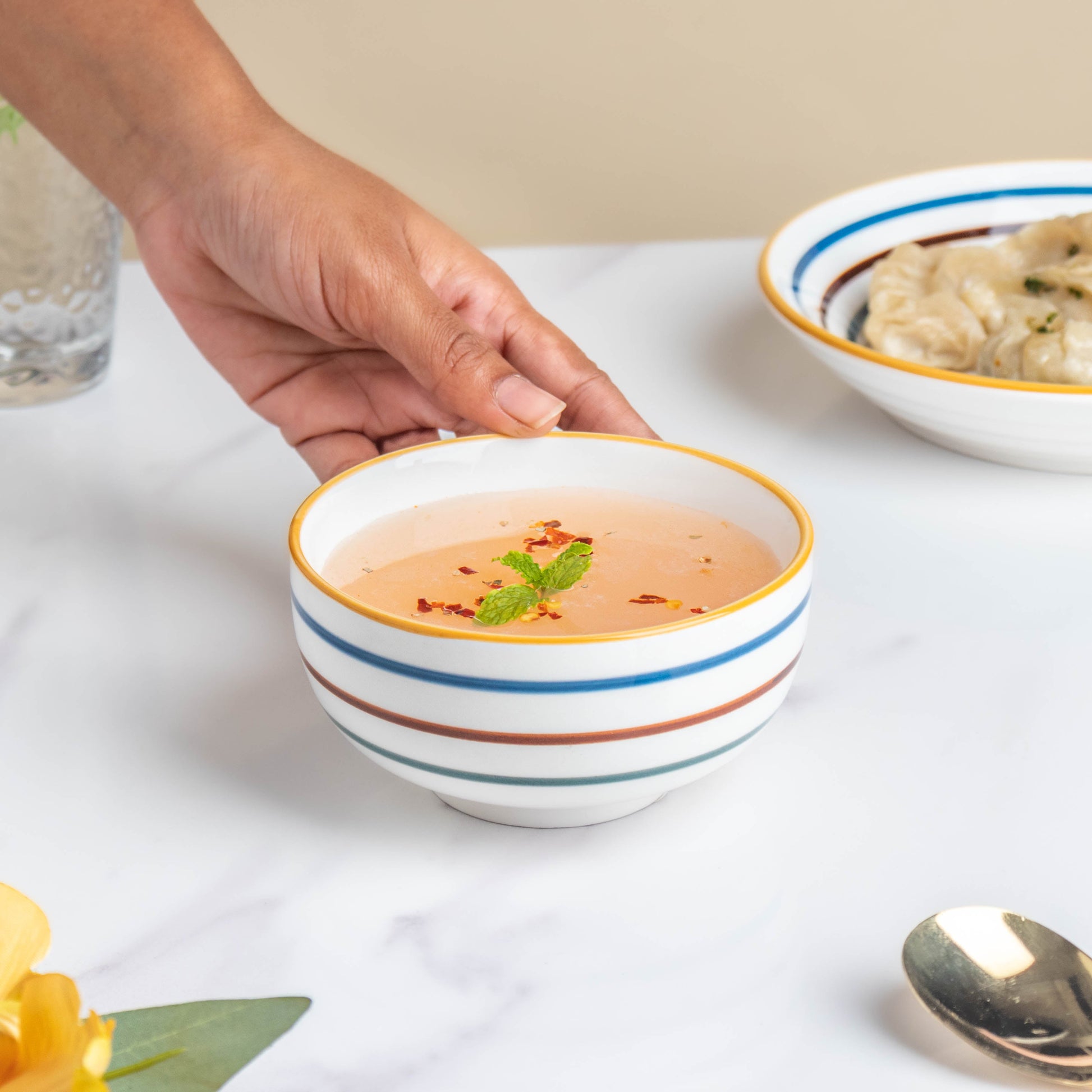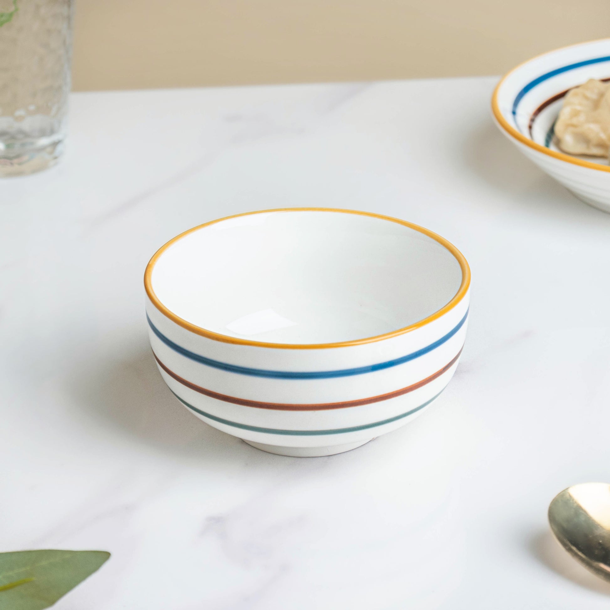 Make serving a bright affair with these elegant ceramic bowls. The bowls come in a multicolored vertical striped pattern that can be used as curry bowls for lentils with gravy, rice, soup, or even breakfast. The minimal print on the pristine white backdrop can add a contemporary touch to the dining setup.