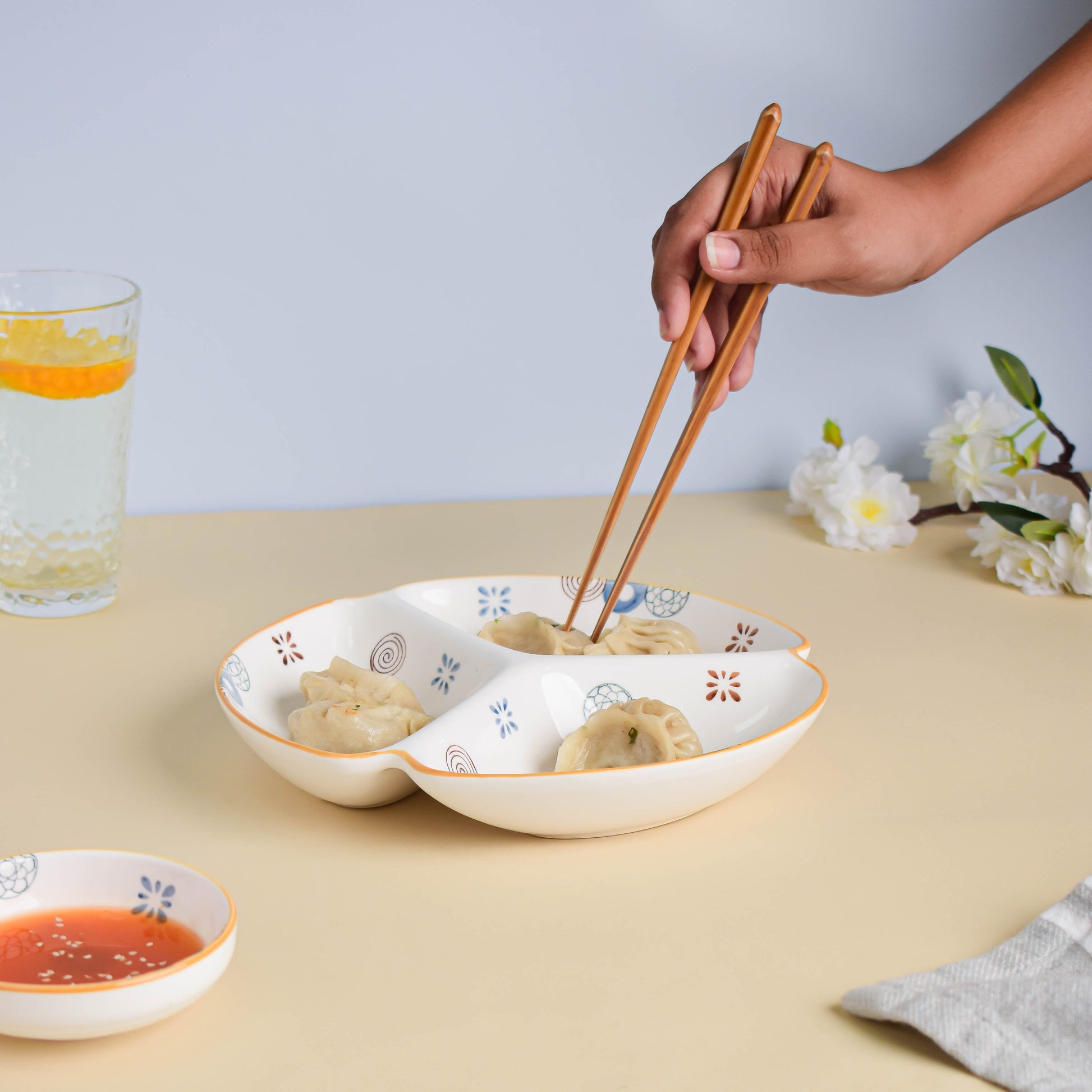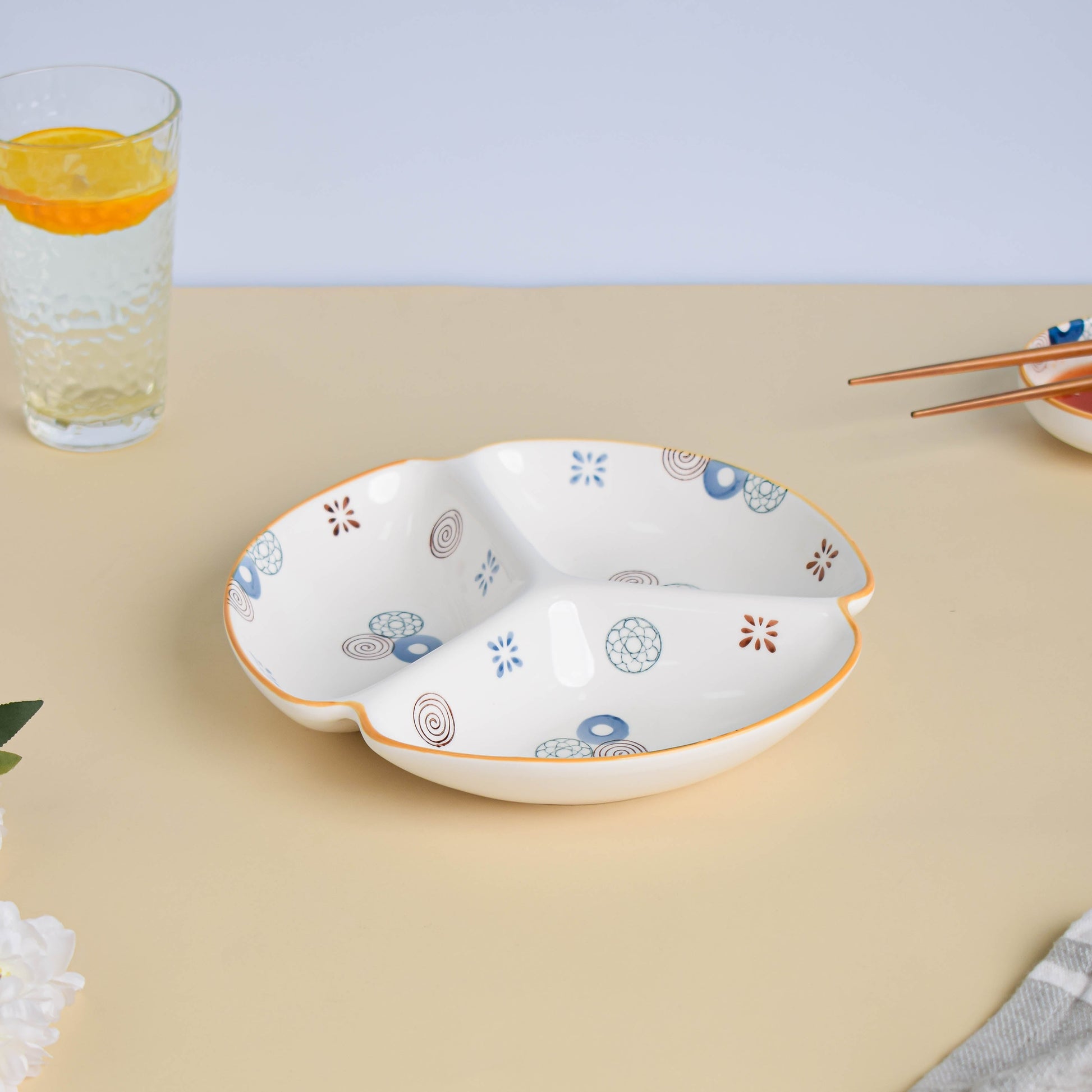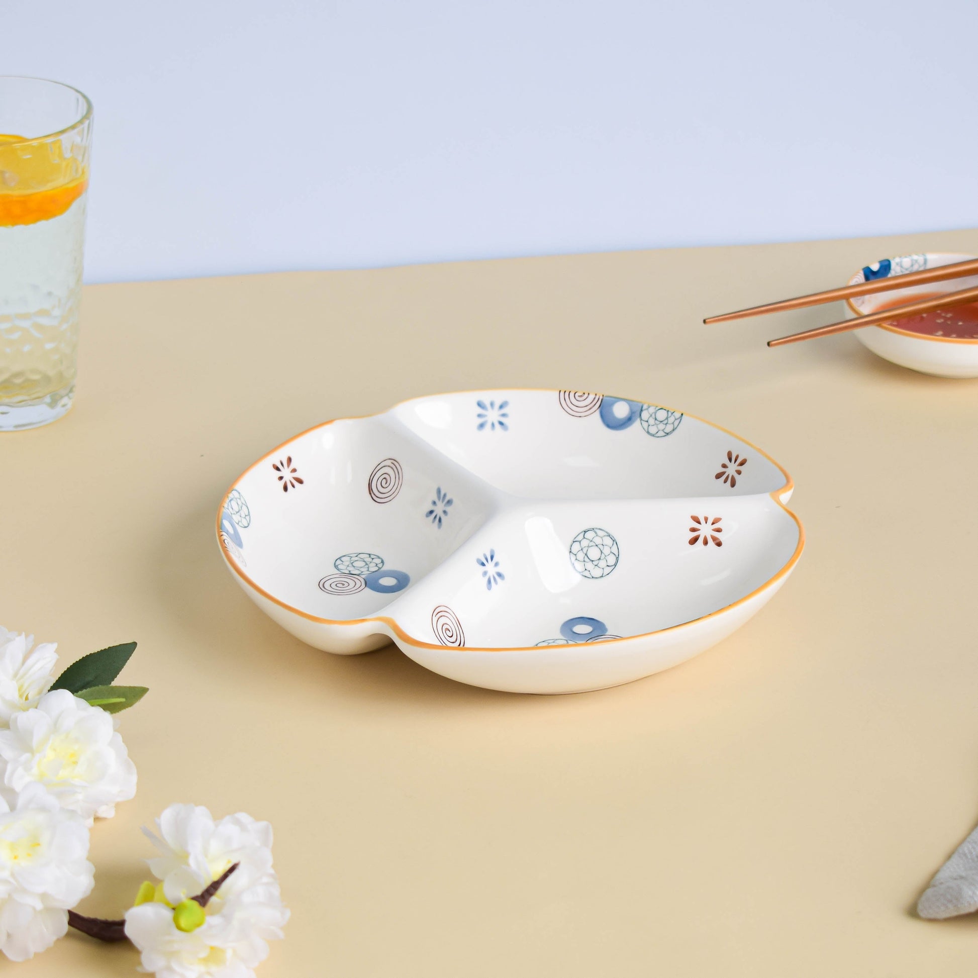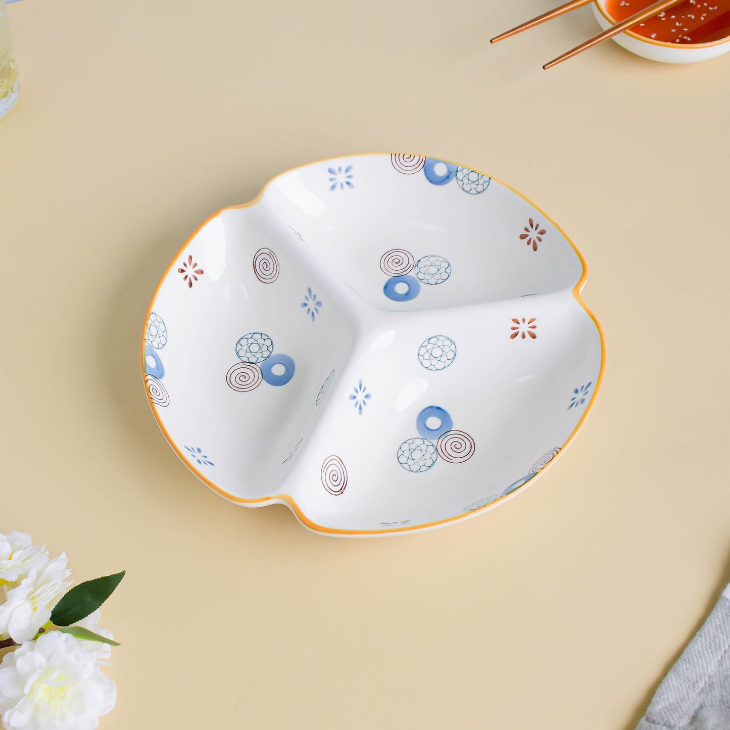 The ceramic section plate with fun motifs makes the perfect snack plate for small get-togethers. The plates have three separate sections, one can be used to serve dips while the other two can be used to serve snacks like nuggets, chips, and more. The plates can also be used to serve varieties of fruits or bread. The quirky prints on the plates can make a table setting look vibrant.