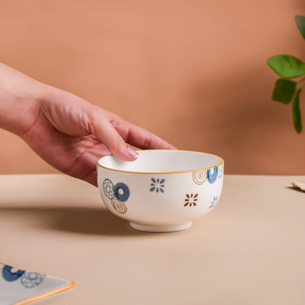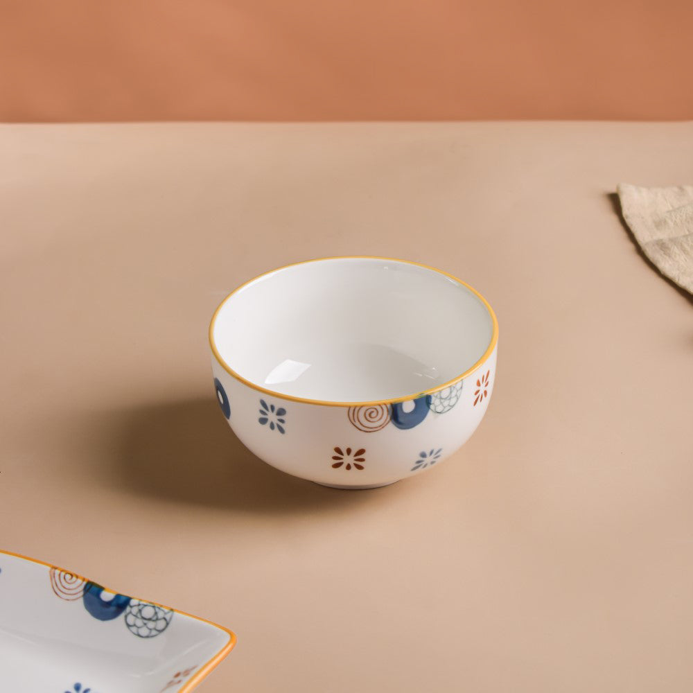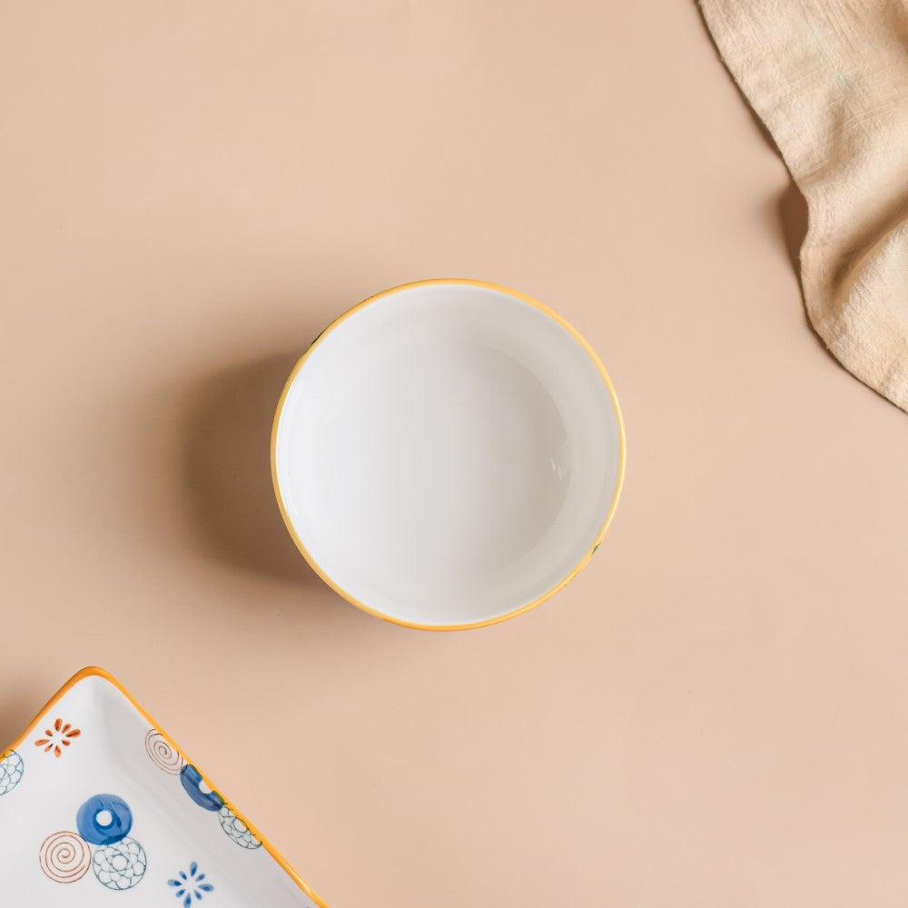 The small ceramic side bowl with a contemporary pattern can be paired up with one of our solid-colored dinner plates to form a plate and bowl set. The bowls can be used as snack bowls or fruit bowls, as well as breakfast, curry, or lentil bowls. One can serve nuts, grapes, bhujia and more munchies in this elegant side bowl. The bowl also adds a pop of colour to the table, making it look more fashionable and inviting.