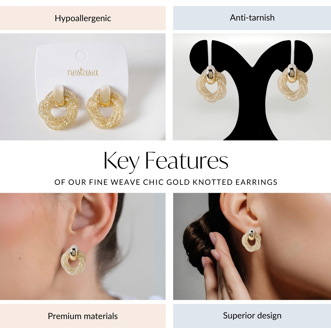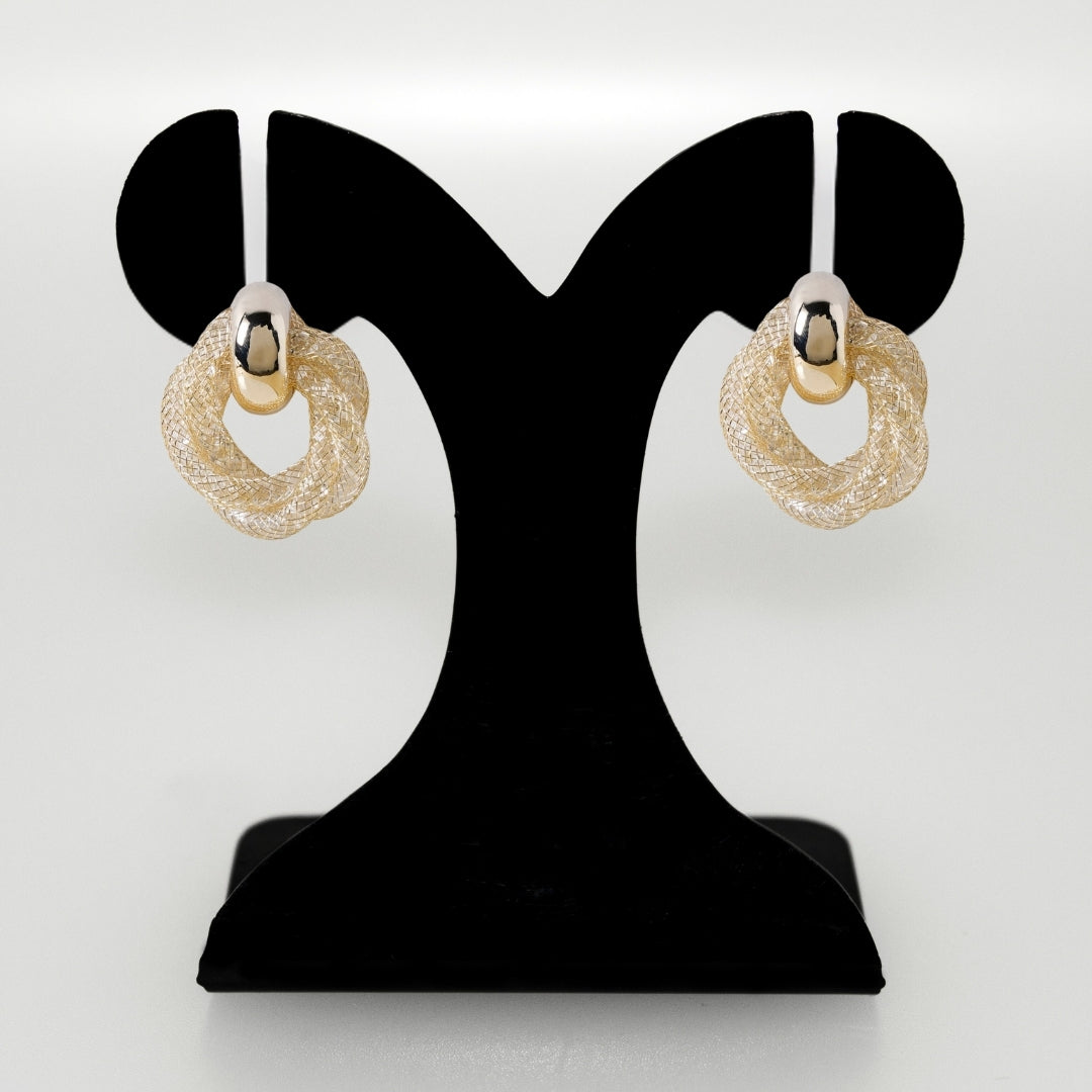 Unveil a blend of elegance and artistry with these stunning gold hoop earrings. Featuring a metal top attached to the back pin, a knotted hoop hangs gracefully beneath, showcasing a beautifully woven design of fine golden metal wires. Small, shimmery stones are delicately nestled within the intricate weave, capturing light and adding a radiant touch. Inspired by timeless craftsmanship and contemporary style, these earrings bring a sophisticated edge to any outfit, effortlessly elevating your look with their delicate texture and subtle shimmer.
