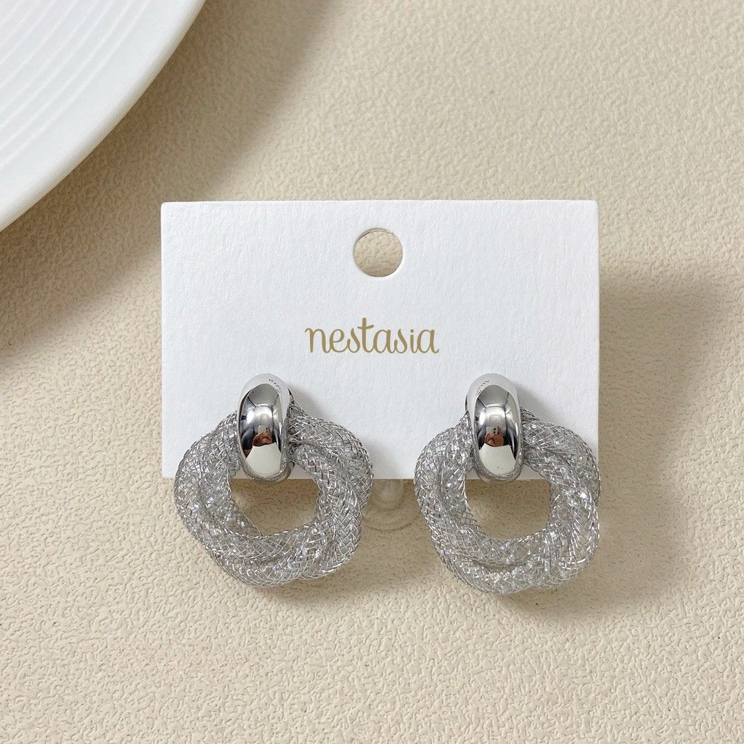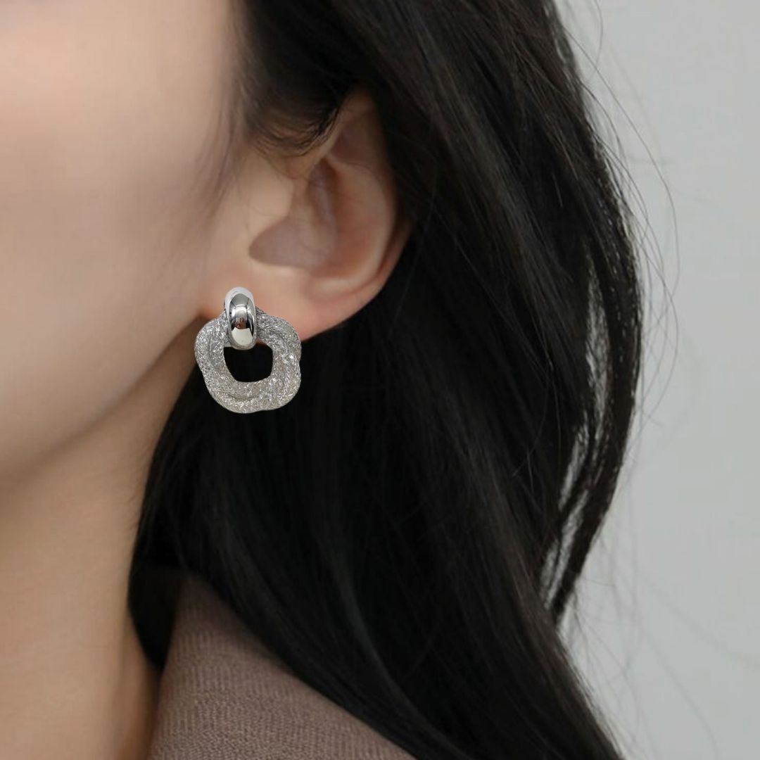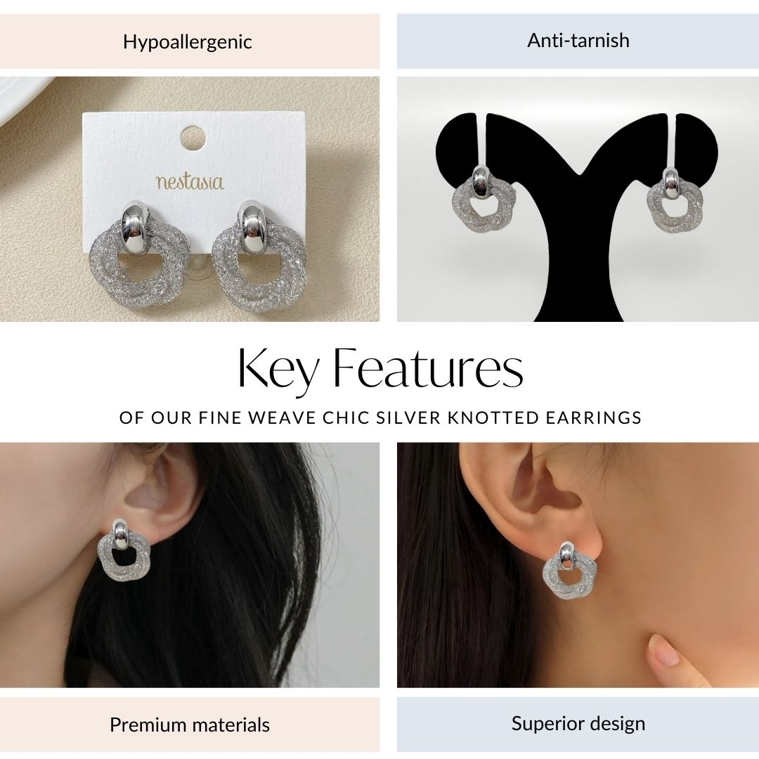 Grace meets artistry in this stunning pair of silver hoop earrings, where a knotted hoop with a fine woven design takes centre stage. Delicate silver wires intertwine seamlessly, adorned with small shimmery stones that add a captivating sparkle. The hoops are anchored by a sleek metal top, ensuring both elegance and comfort. Perfect for elevating casual ensembles or adding glamour to formal attire, these earrings are a testament to timeless sophistication and intricate craftsmanship.