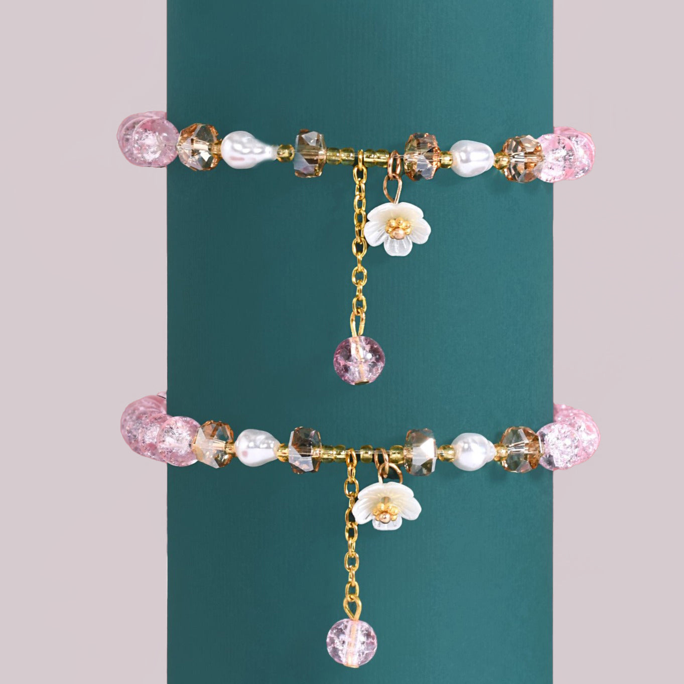 Floral elegance never goes out of style and our gorgeous bracelet is living proof! Crafted to add a special touch to your wardrobe, the adjustable bracelet features an elastic band with an array of subtly pink translucent beads, warm amber beads, and artificial teardrop pearls. Gracefully dangling from the bracelet is a link chain tassel with a mini flower charm atop and a glimmering bead to top it off. From casual to glam, this stunning brace will enhance the appearance of all your looks.