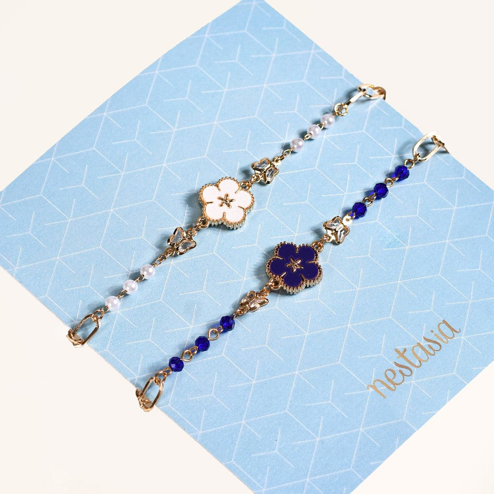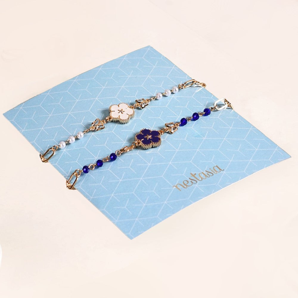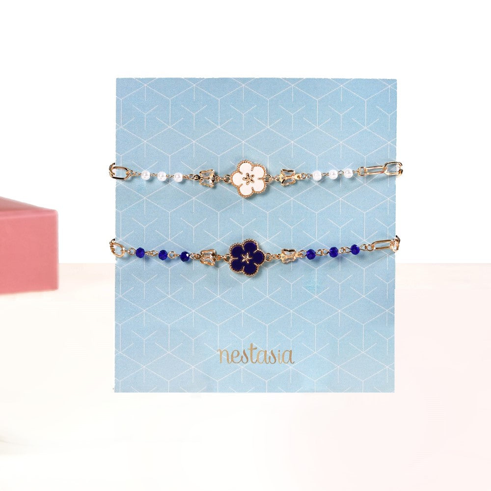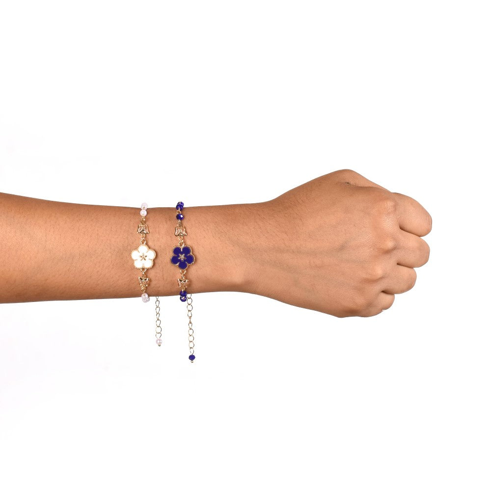 Adorn your wrists with floral elegance with our set of 2 floral bracelets for women. Designed to complement various outfits and styles, the dainty link chain bracelets are available in 2 vibrant colours - white and navy blue. Each bracelet showcases gorgeous flower ornaments encased in gold borders and translucent butterfly charms. Accentuated by mini artificial pearls and equipped with lobster clasps, these elegant and understated bracelets are perfect to add a touch of charm to your outfits.