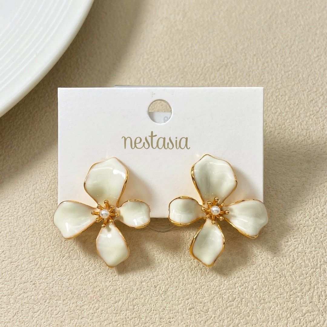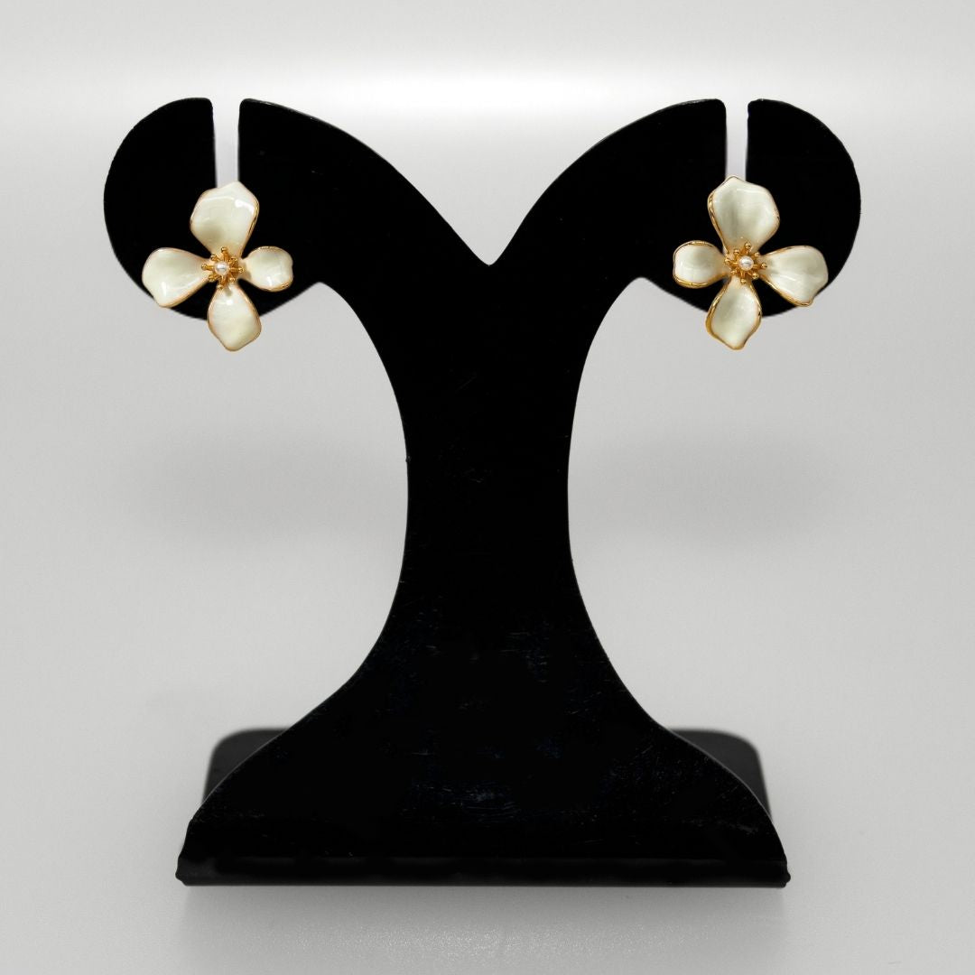 An extraordinary expression of delicate beauty and contemporary allure, these floral stud earrings embody timeless elegance. Inspired by the graceful simplicity of nature, the design features golden hues and soft, curved petals in a pristine white tone. The centre is adorned with a lustrous faux pearl, enhancing the earrings' refined and sophisticated appeal. Perfect for adding a touch of elegance to any ensemble, these earrings seamlessly blend classic charm with modern style.