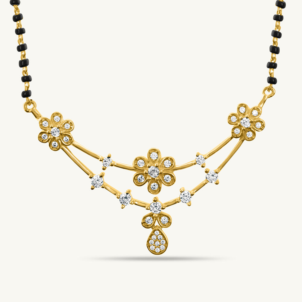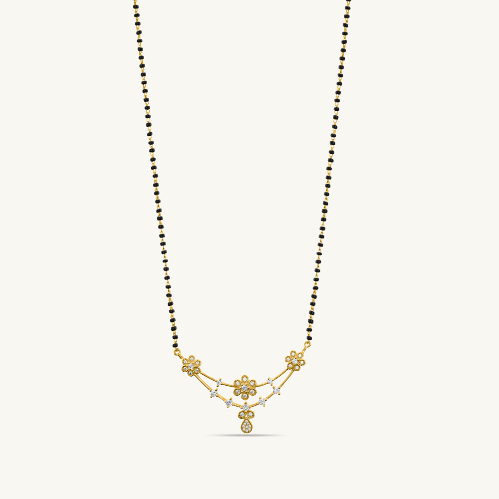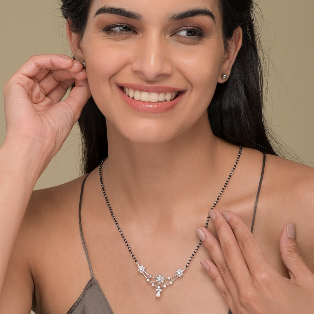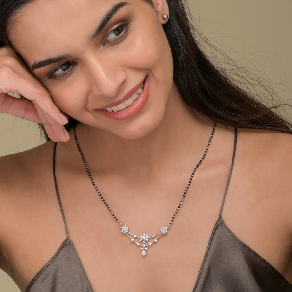 Elevate your traditional attire with the Floral Elegance Mangalsutra. Adorned with intricate floral patterns, this stunning piece features a decently sized pendant, blending traditional charm with modern aesthetics. Crafted in fine silver, it's the perfect embodiment of grace and sophistication, making it an exquisite addition to your jewellery collection.