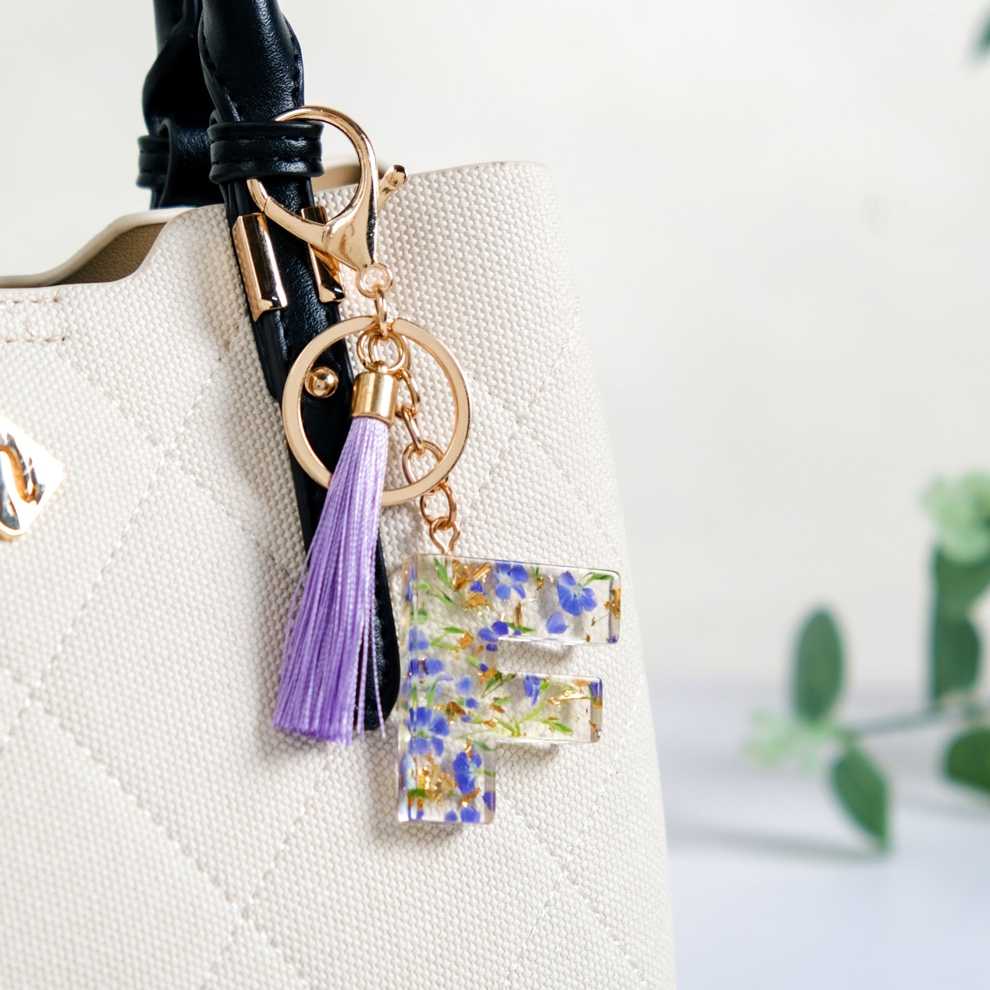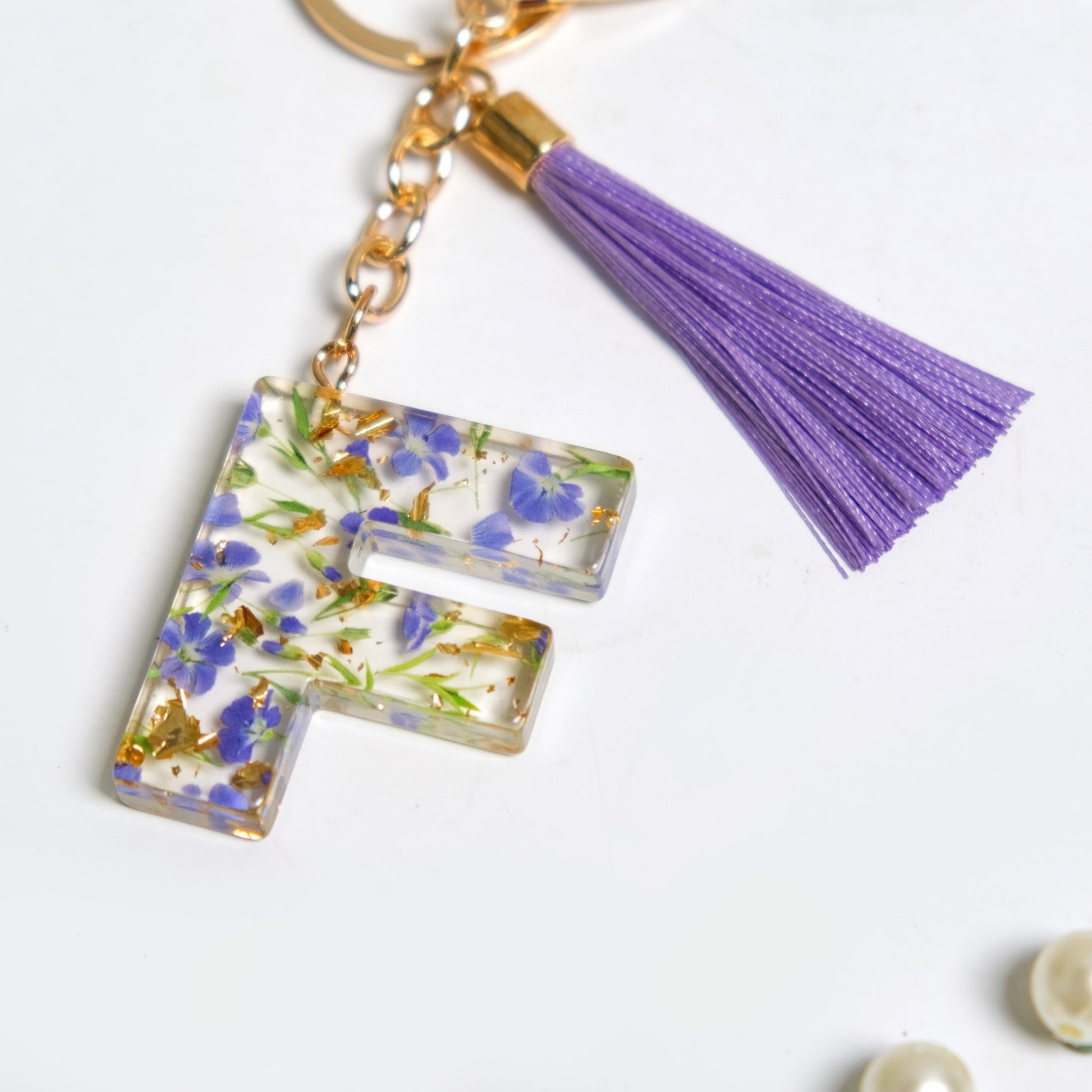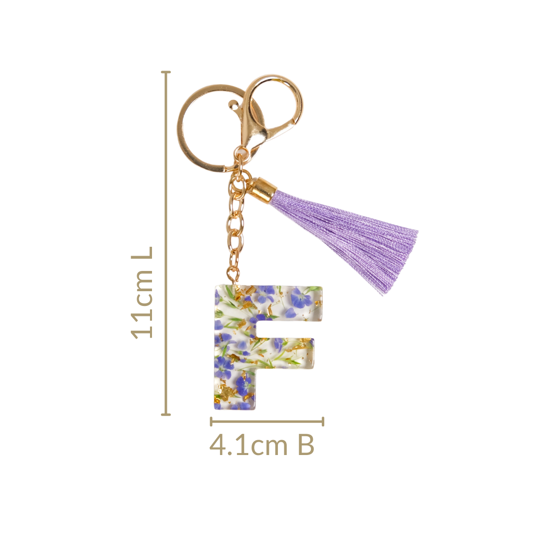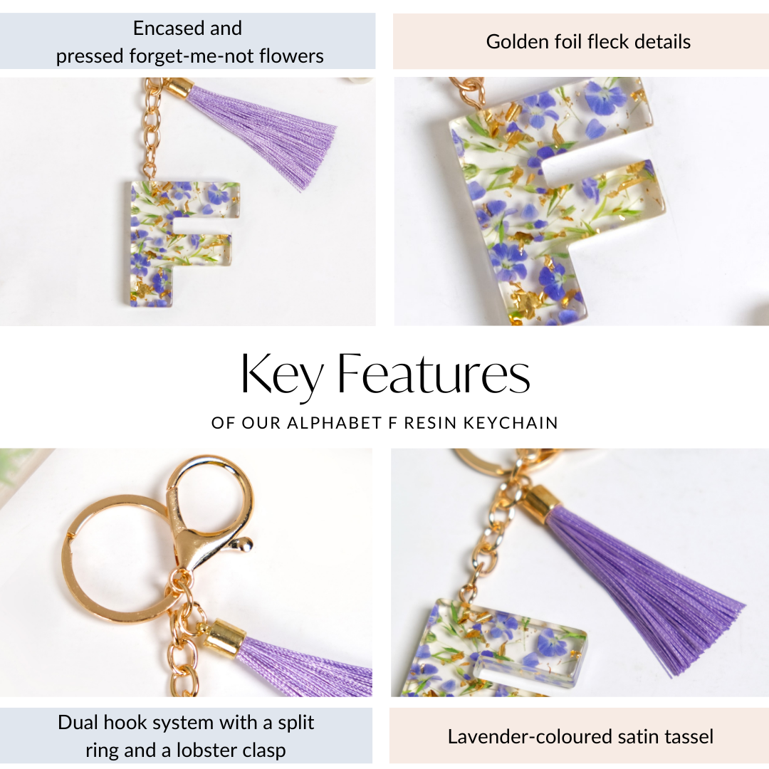 Infuse charm and utility into your everyday essentials with the chic “F” resin keyring. This cute keychain features pressed lavender forget-me-not flowers, or scorpion grass, known for their symbolic association with love and cherished memories. The entire design is encased in stunning transparent high-quality resin shaped like the English alphabet "F".