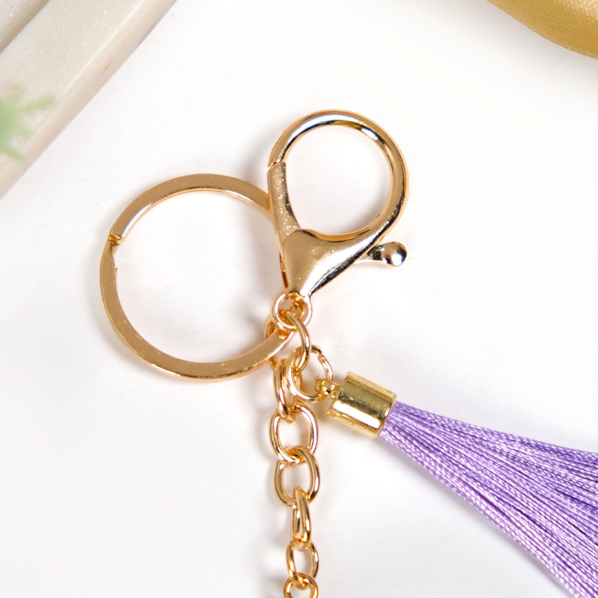Golden flecks add a subtle shimmer, while a stylish satin tassel provides a decorative touch. The keyring is lightweight and long-lasting, designed with dual hooks, a split ring and a lobster clasp, making it easy to attach to keys, bags, or accessories for a standout. This resin keyring is a must-have versatile piece in your collection.