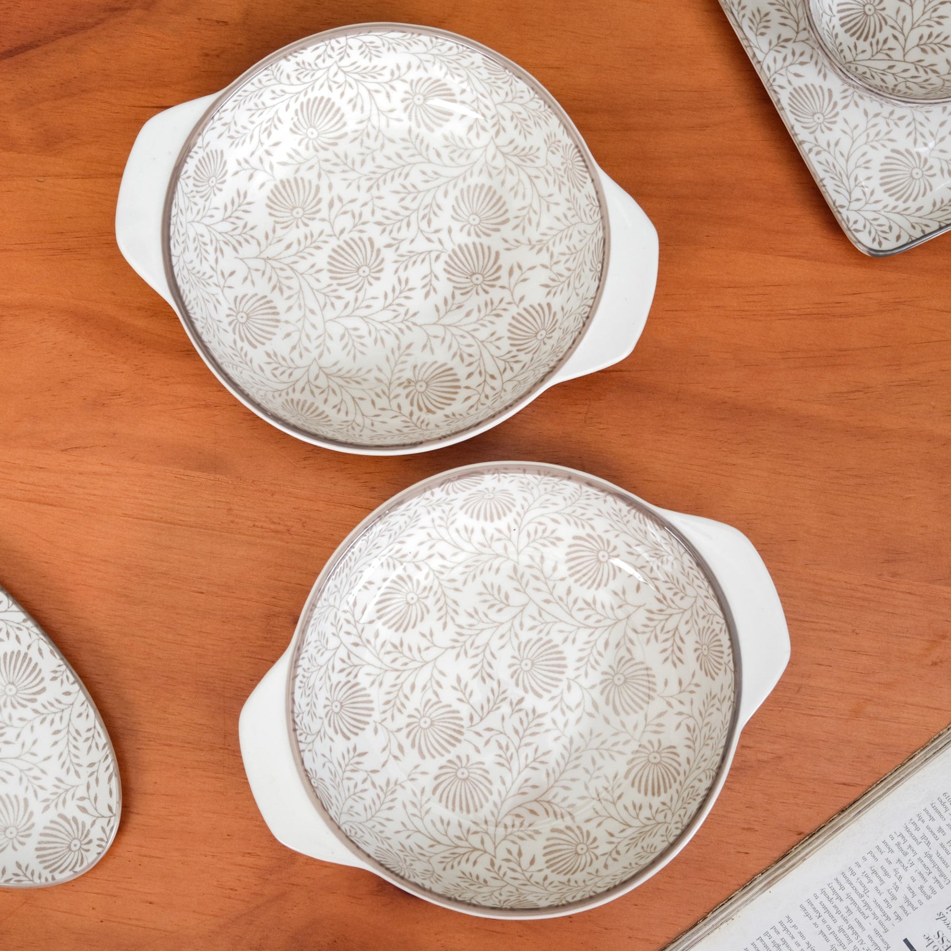 Design: Adorned with a printed floral design, these ceramic bowls with handles bring a touch of nature-inspired charm to your dining table. The smooth gloss finish enhances their aesthetic appeal, making them ideal for both casual meals and special occasions. The thoughtfully designed handles ensure easy and secure handling, allowing you to serve with ease and style.