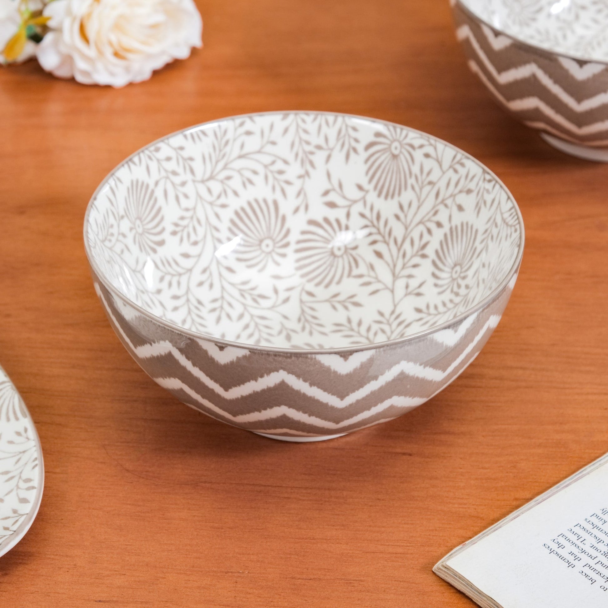 Design: The set of ceramic bowls features a beautiful printed floral design in soothing beige on the interior, adding a touch of elegance to your serveware collection. The outer surface is adorned with intricate zig-zag patterns, offering a unique visual contrast. A smooth gloss finish enhances the overall appeal, making the bowls equally suited for daily use or special occasions.
