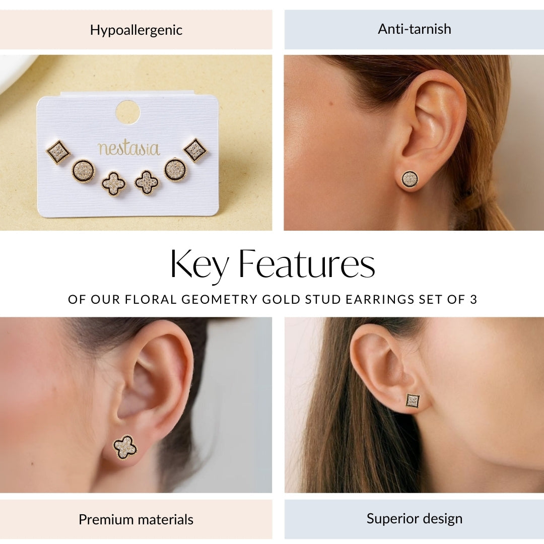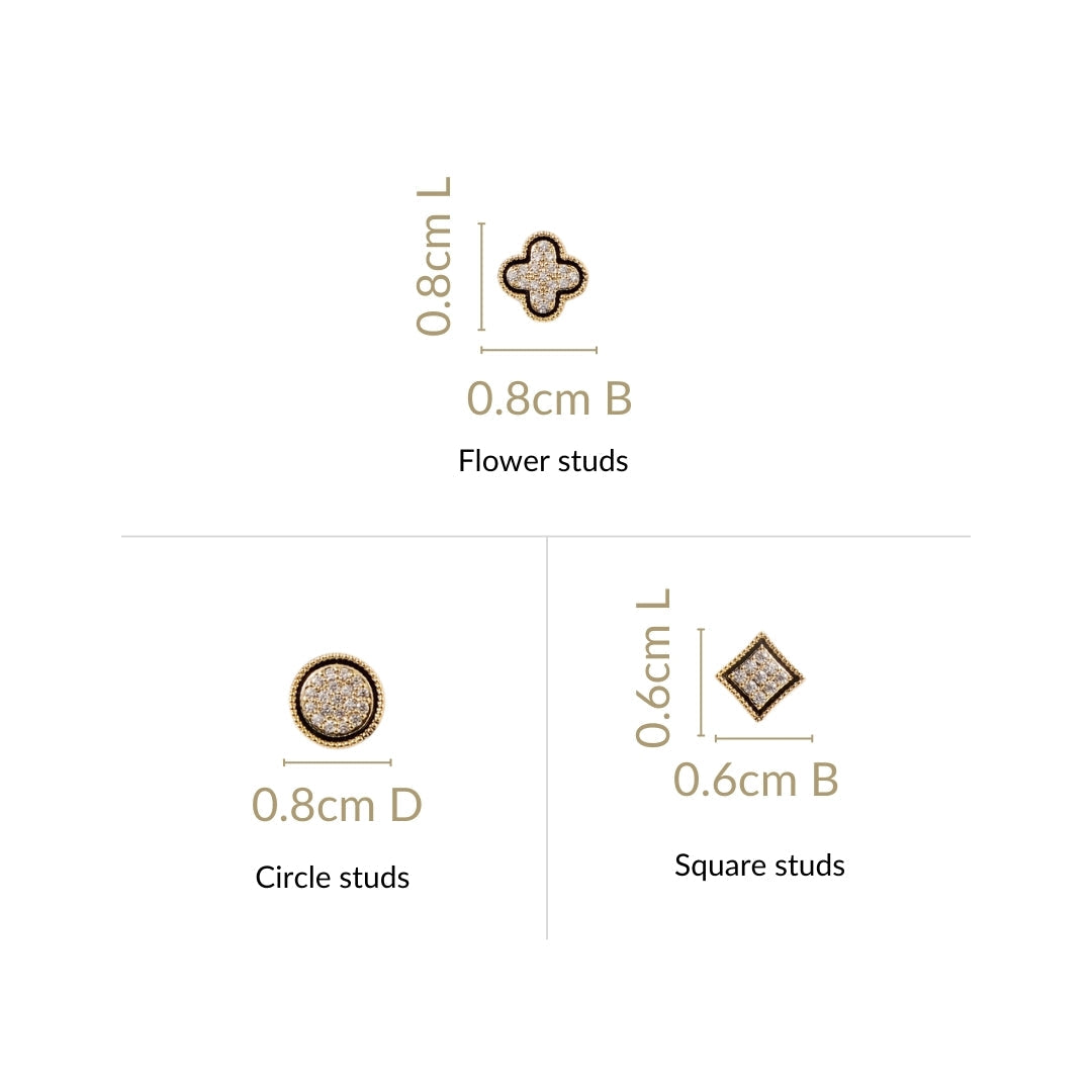 Add a touch of timeless elegance to your jewellery collection with this set of 3 pairs of gold-toned stud earrings. Featuring sparkling stone embellishments, the set includes a floral-shaped pair inspired by blooming gardens, a circular pair symbolising unity and harmony, and a square pair that reflects modern geometric aesthetics. Perfect for both casual outings and formal occasions, these versatile studs complement any ensemble. Crafted from durable metal with a radiant gold finish, each design combines intricate craftsmanship with enduring style, making this set an ideal addition to your accessory lineup.