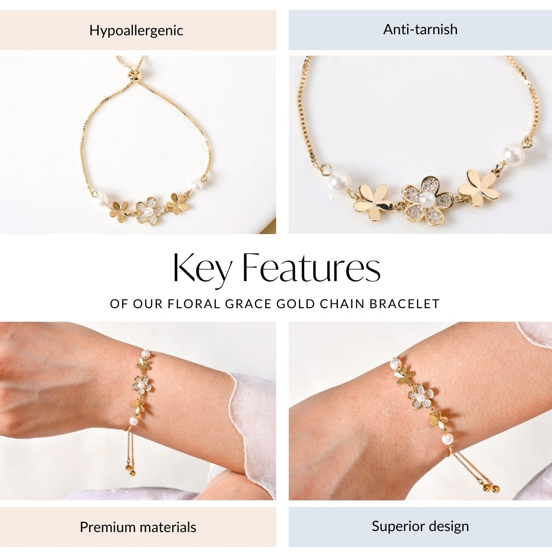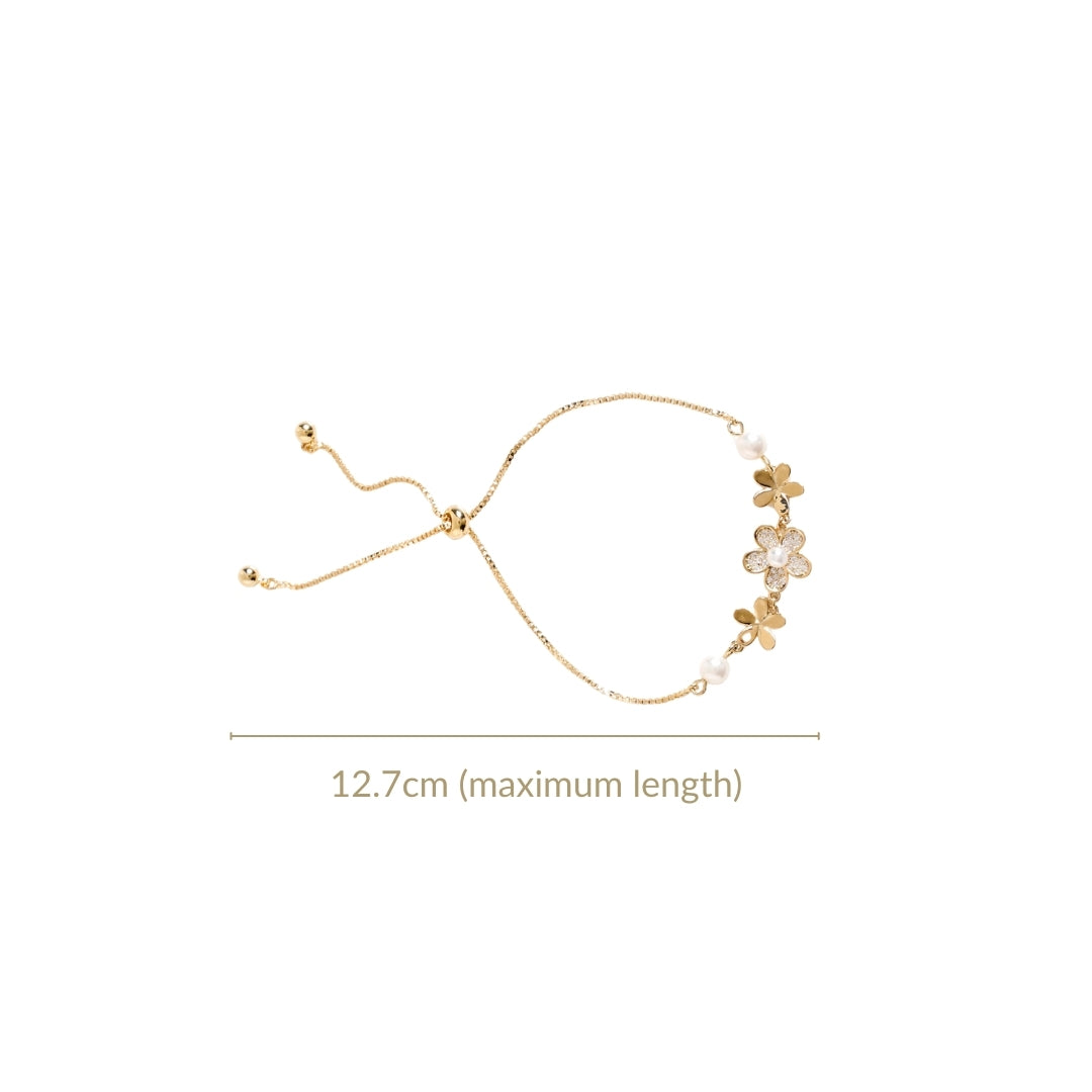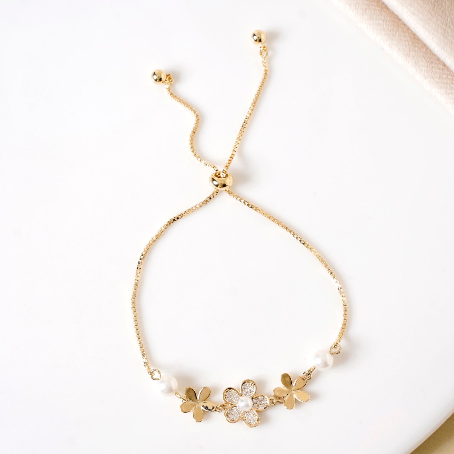 A gentle expression of playful elegance, this gold bracelet captures a moment of effortless beauty. Reminiscent of nature’s subtle yet captivating movements, it intertwines soft golden hues with the delicate gleam of faux pearls and the quiet sparkle of diamantes. At its heart, a central flower motif, adorned with shimmering gems and a luminous faux pearl, becomes the centerpiece, while the surrounding floral accents add a balanced, refined touch. With its adjustable chain, this piece offers the perfect fit, making it a versatile and timeless addition to any collection.