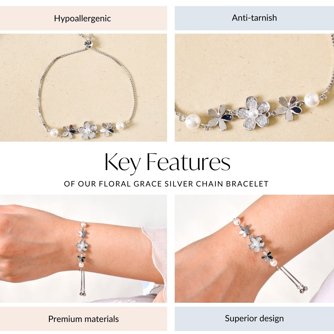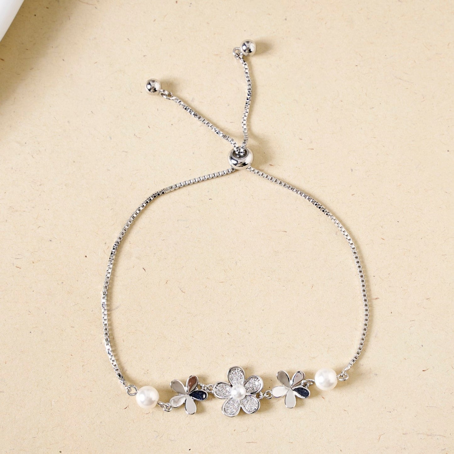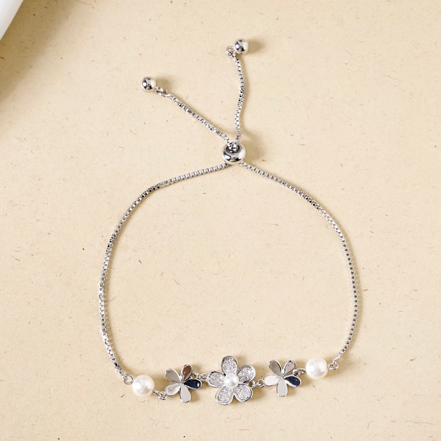 A whisper of elegance, this bracelet speaks of quiet moments and understated beauty. Inspired by the free-spirited side of nature, this chain bracelet combines the subtle glow of silver with the delicate shimmer of faux pearls and diamantes. A central flower, sparkling with tiny gems and crowned by a luminous pearl, steals the show, while the surrounding floral accents create an air of graceful sophistication. With an adjustable chain, this piece fits any wrist, making it a versatile statement of timeless charm.