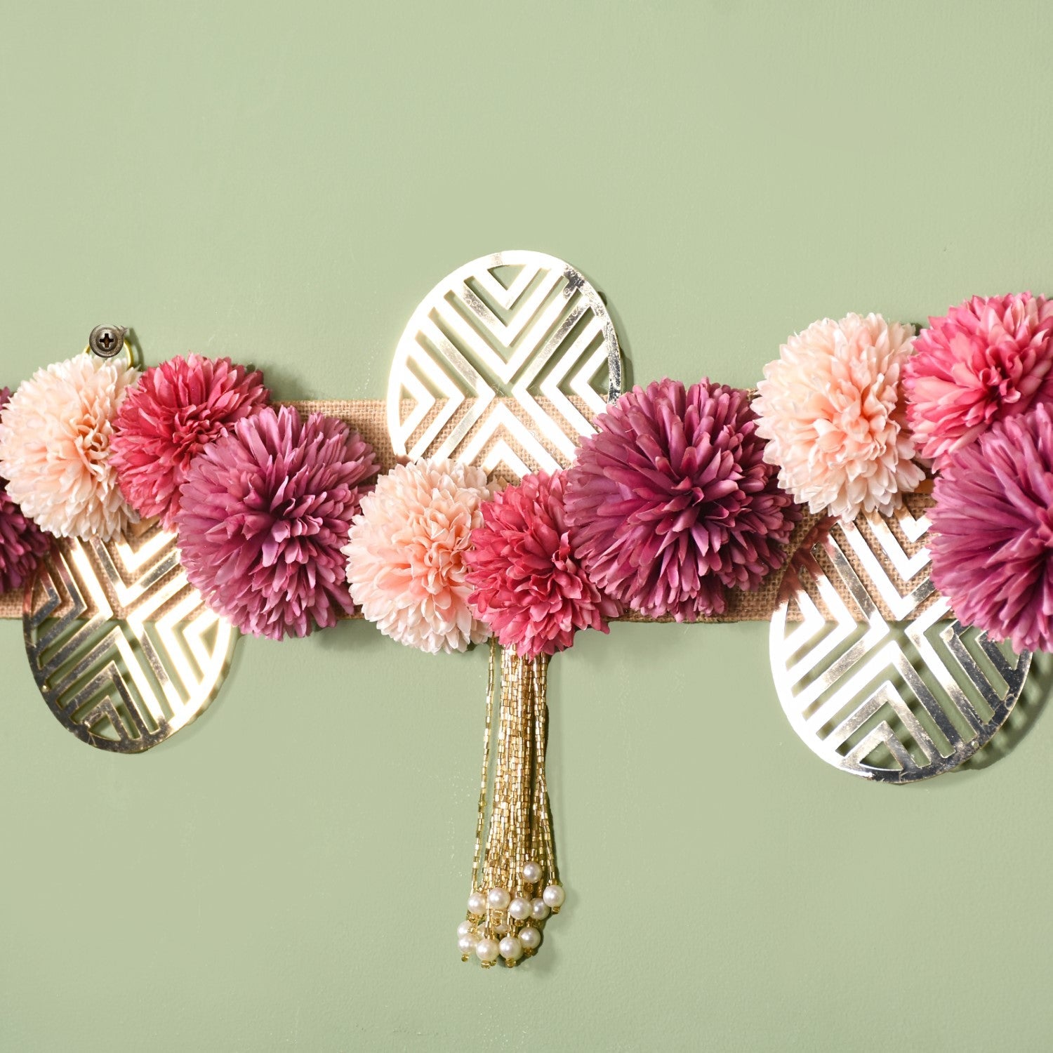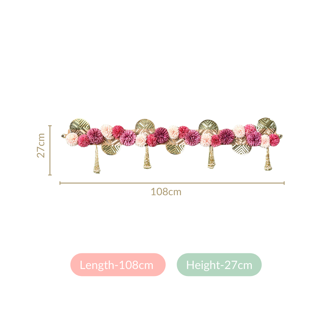 Design: Set on a sturdy, eco-friendly, and sustainable laminated jute base, the wall hanging is lined with fabric flowers in vibrant shades of pink, lilac, and subtle peach for pretty pops of colour. Further accentuated by sheet metal discs with eye-catching geometric cutwork, this hanging decoration is just what your home needs. Complemented by shimmering bugle bead tassels with pearl inserts, this handcrafted marvel will take every celebration beyond the ordinary.