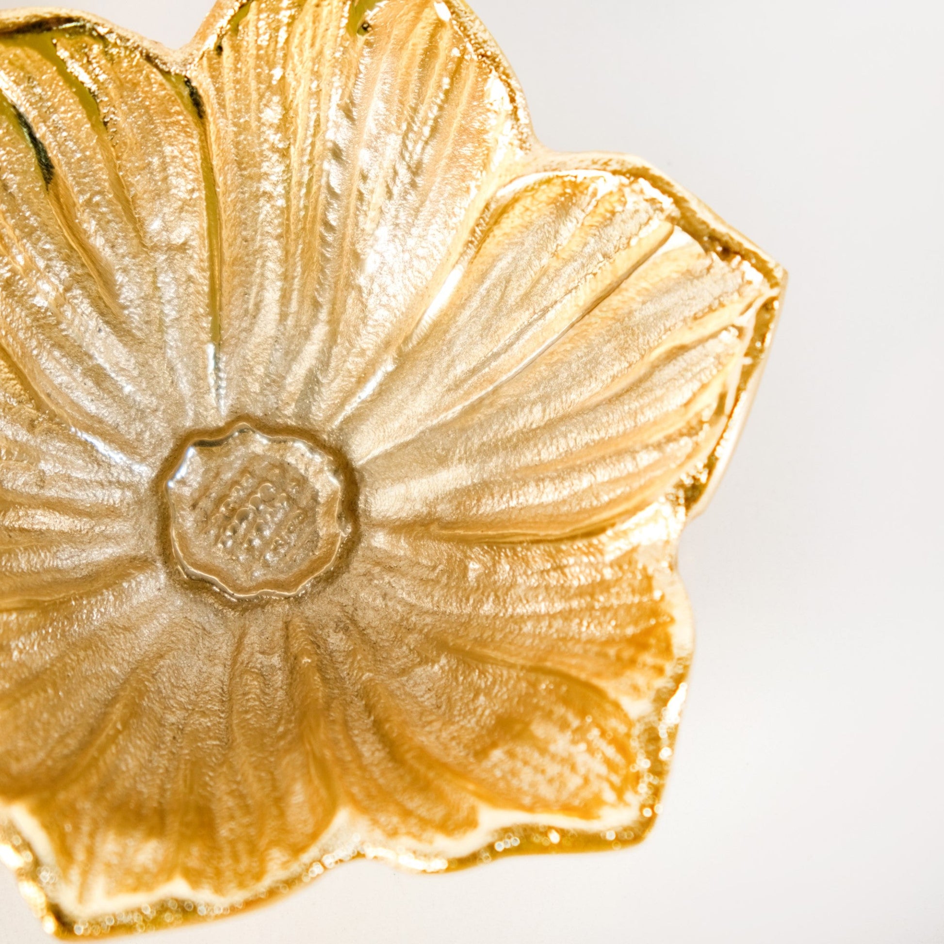 Design: This flower-shaped trinket bowl features a detailed flower bed design with intricately carved petal patterns all around the rim. Crafted from durable Aluminium with a lustrous gold metallic finish, the bowls catch light beautifully. The textured surface adds visual depth and a tactile feel. Each tray has a flat, sturdy base that ensures stable placement on any surface. Their compact size is ideal for holding jewellery, keys, or festive decor accents. Perfect for adding a botanical touch to your dresser or entryway table.