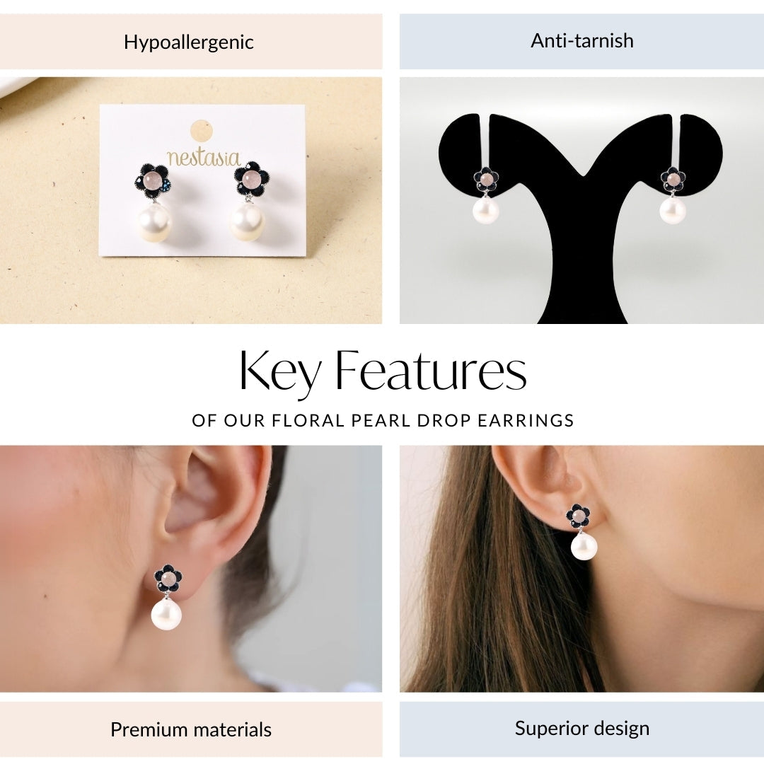 A beautiful fusion of nature and elegance, these drop earrings are a testament to timeless charm. Inspired by the delicate allure of blooming flowers, the earrings feature a small flower with black petals, its silver-edged rim framing a translucent pink ball at the center. The drop gracefully extends into a lustrous faux pearl, creating a perfect balance of sophistication and subtle femininity. Ideal for those who seek a refined touch, these earrings add a gentle, yet striking elegance to any occasion.