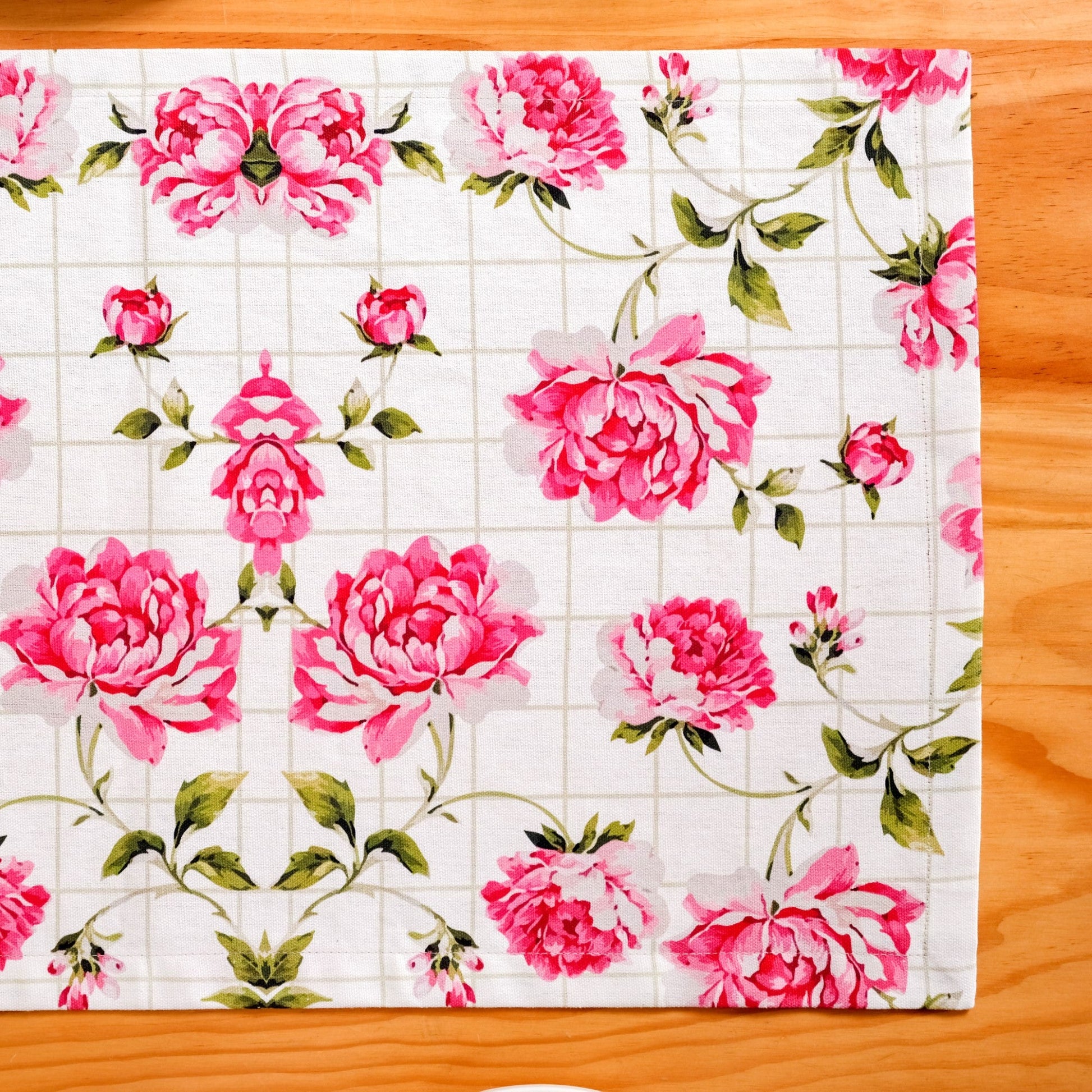 Design: Beyond its stunning visual appeal, this runner is a testament to meticulous craftsmanship. The vibrant pink peonies, brought to life through intricate embroidery, beautifully contrast with the subtle geometric grid, creating a striking yet perfectly balanced centrepiece. Woven from pure cotton, the fabric offers a luxurious feel and may experience a slight natural shrinkage (approximately 5-6%) after washing, easily restored with a gentle warm iron to its original graceful drape.