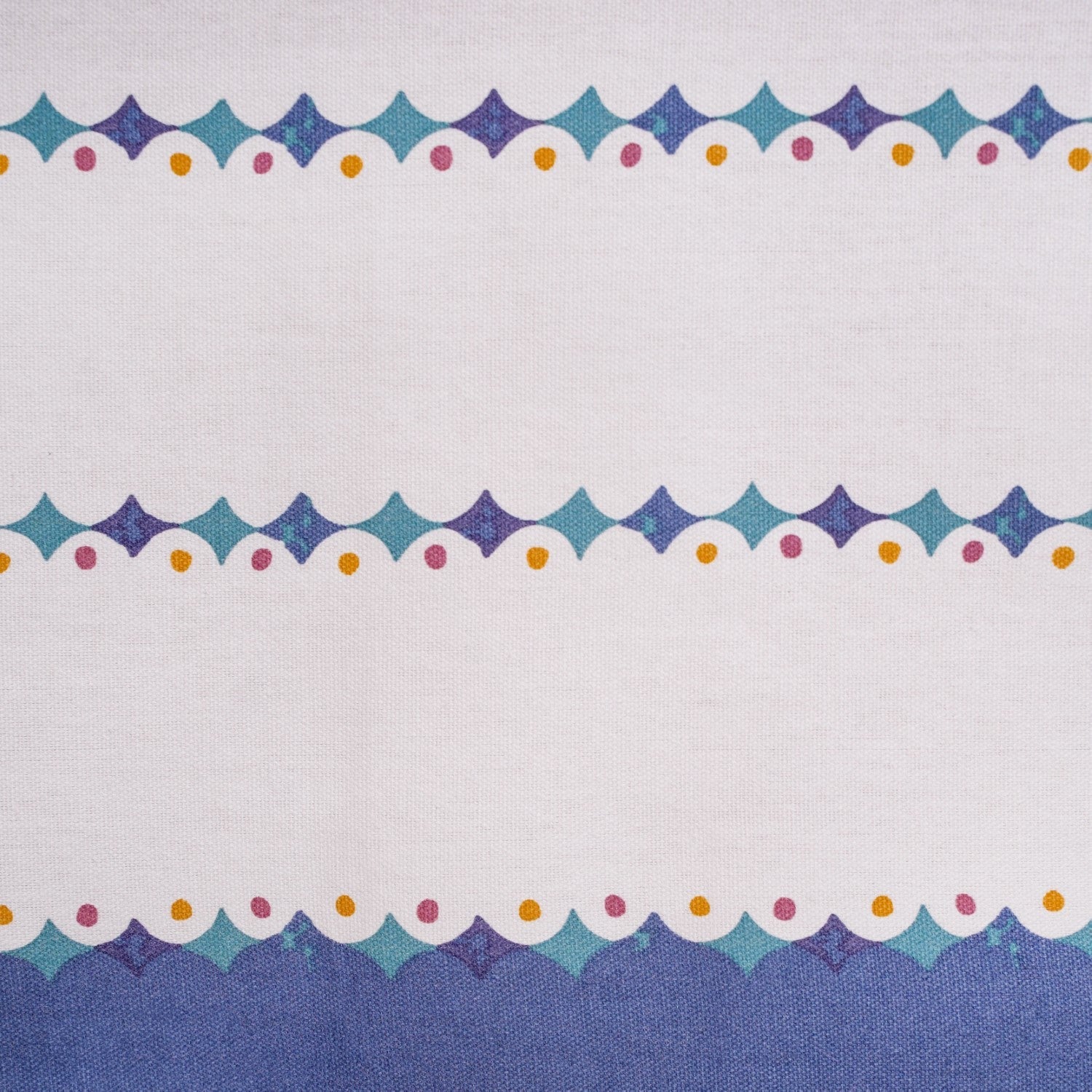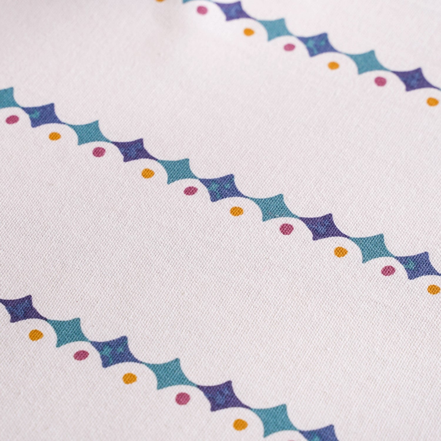 Design: This eight-seater cotton tablecloth features a clean, contemporary look that combines understated geometry with bold colour accents. The top section is detailed with evenly spaced horizontal rows of scalloped diamond shapes in alternating teal and navy, punctuated by cheerful dots in mustard yellow and berry pink. These sit against a soft off-white base, creating an open and airy visual effect. Along the border, a rich slate blue panel anchors the design, providing contrast and sophistication. Expect minor shrinkage (5–6%) after washing, but a gentle iron restores its original size. Its thoughtful balance of pattern and simplicity makes it suitable for both everyday dining and festive gatherings.
