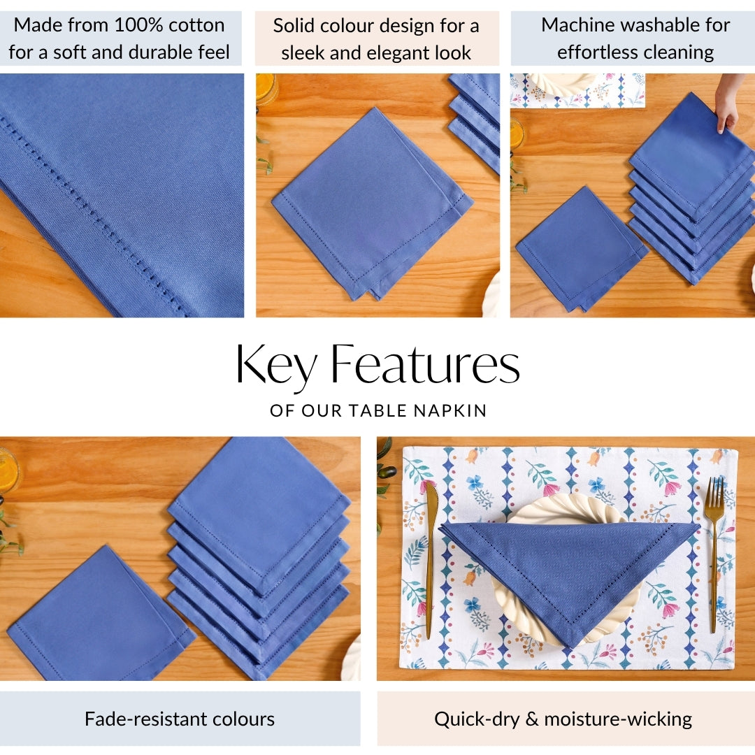 Design: This set of cotton table napkins showcases a rich slate blue hue that strikes the perfect balance between classic and contemporary. The colour, reminiscent of dusky skies and cool, moody undertones, adds a sophisticated touch to any table setting. Each napkin is neatly hemmed with fine stitching along the edges, giving it a tailored, refined finish. The fabric’s soft matte catches light subtly, offering visual depth without any shine. Generously sized, these napkins drape beautifully, whether folded crisply for formal dining or styled casually for everyday use.