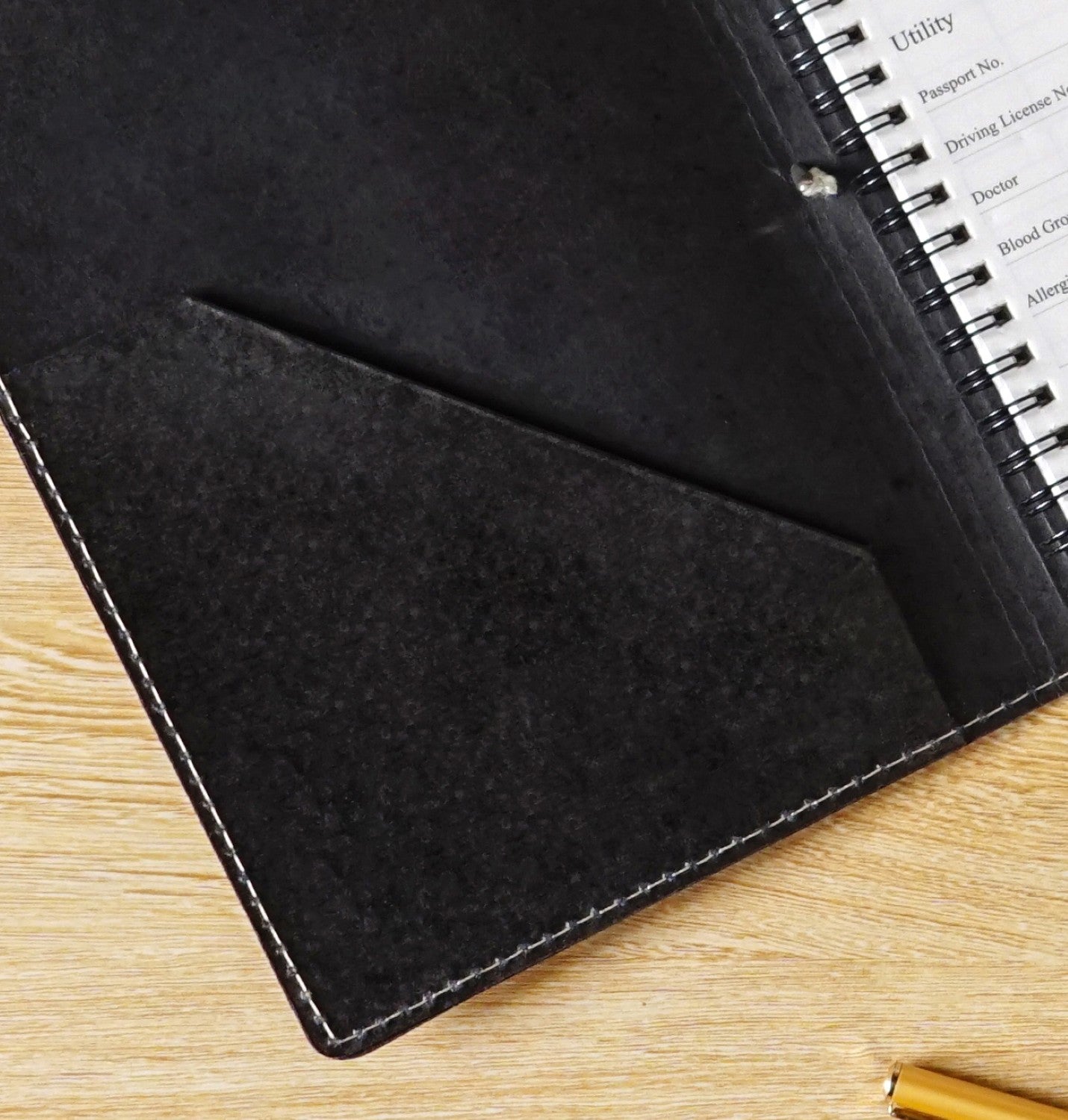 Design: This notebook boasts a stunning design that pairs structure with softness. One half is wrapped in deep green eco-leatherette, featuring a textured, pebbled finish and clean white stitch detailing, exuding elegance. The main cover blooms with delicate florals in pastel tones, soft whites, peach, dusky blues, and muted greens, all painted on a subtly textured cream base, echoing a happy garden. The notebook is secured with a slim white elastic band that gently hugs the cover, giving it a tied-journal charm while keeping your pages safe. The premium paper inside feels smooth under any ink. A strong black spiral binding allows the notebook to lie flat, making writing effortless, while the flap pocket inside securely holds quick-access items like notes and tickets. The inside includes structured sections for personal information, emergency contacts, monthly plans, and plenty of lined pages for free-form writing.