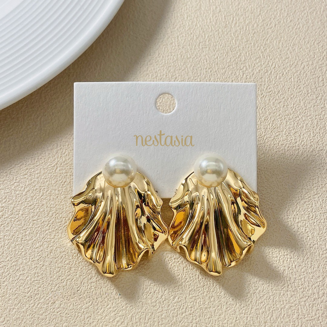 A bold fusion of elegance and artistry, this pair of metal gold-toned pearl statement earrings brings an abstract three-dimensional design to life. With their striking sculptural shape and lustrous pearls, they add a sophisticated touch to any look. Inspired by the organic flow of modern art, the earrings blend geometric structure with fluidity, making them a standout accessory. Perfect for those who seek to express their unique style, these earrings are a timeless statement of creativity and elegance.