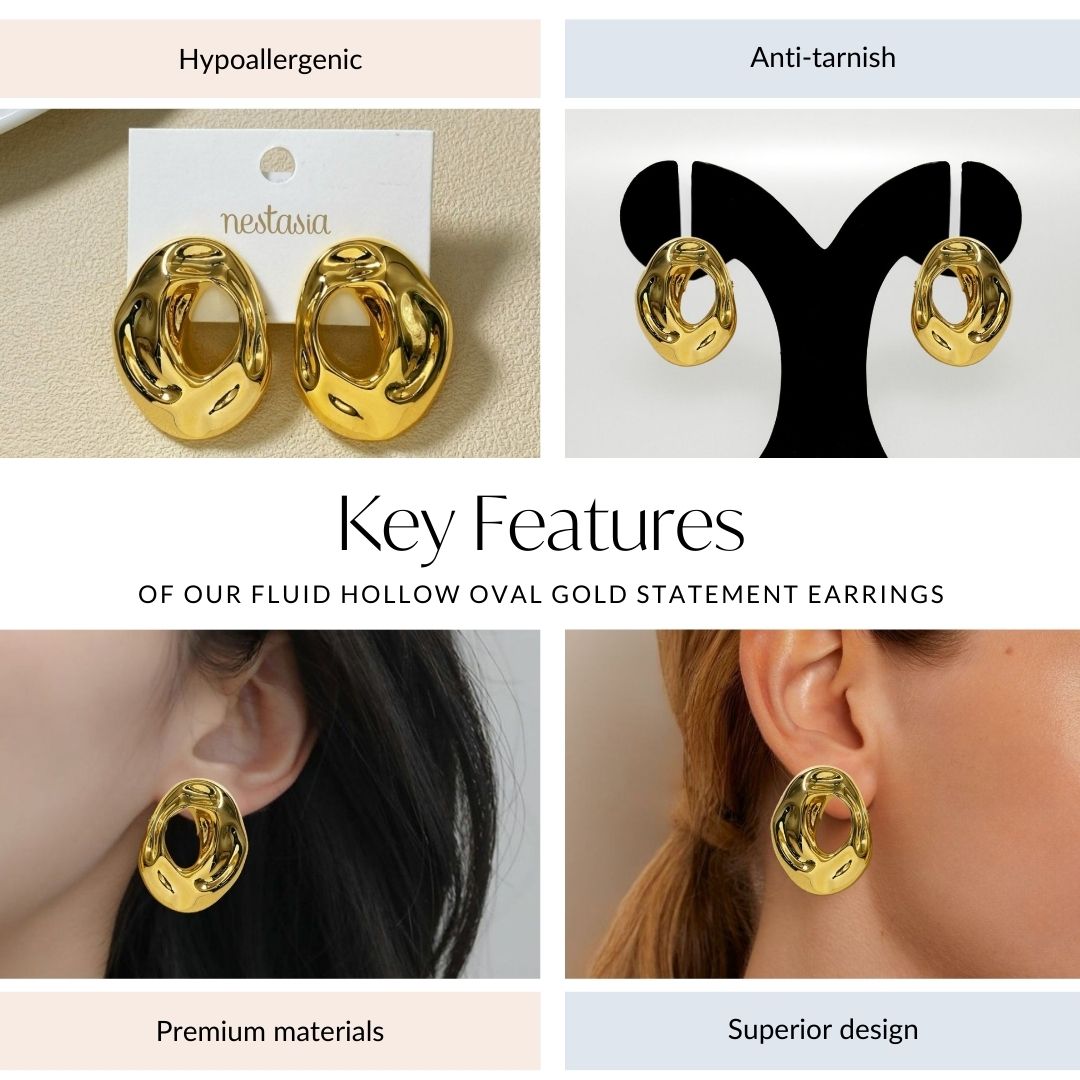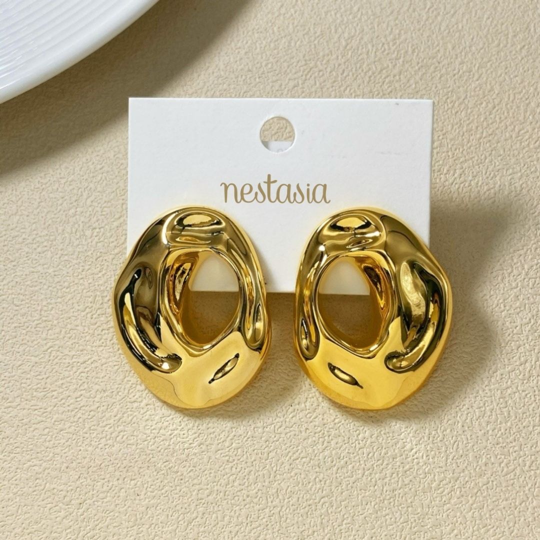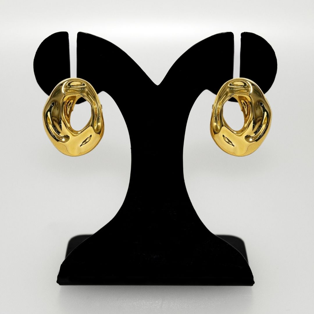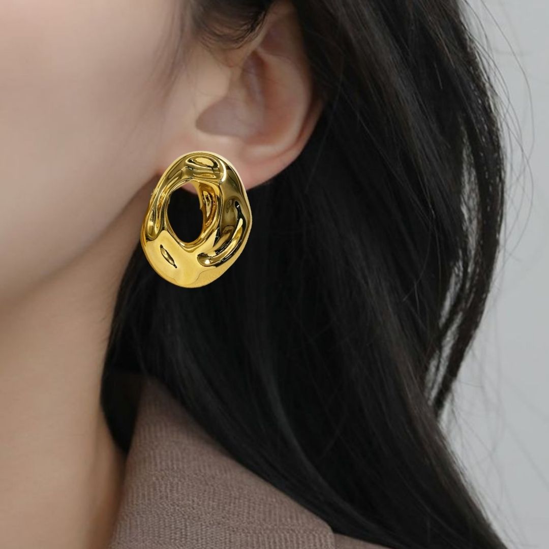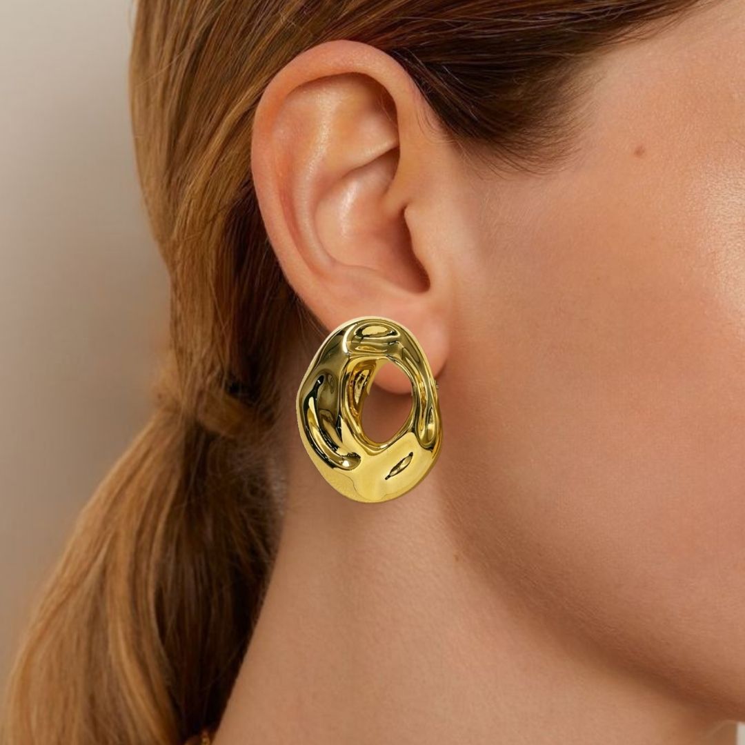 Make a bold style statement with these exquisite gold-toned metal earrings, featuring a striking oval shape with a hollow centre. The abstract textured design is inspired by modern fluid art, showcasing intricate patterns that celebrate movement and creativity. These earrings effortlessly blend contemporary aesthetics with timeless elegance, making them the perfect accessory for any occasion. Whether you’re dressing up for an evening out or adding flair to your everyday look, these earrings will enhance your style and showcase your individuality. Embrace the art of accessorising with this stunning piece!