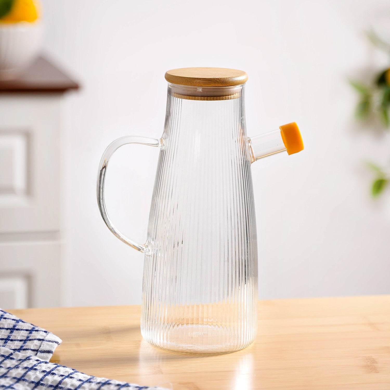 Design: This oil bottle is a masterpiece of minimalist elegance. It boasts a captivating elegant fluted design that creates beautiful vertical lines, catching the light and adding a touch of sophistication to any setting. The clear glass allows you to appreciate the contents within, whether it's golden olive oil, rich sesame oil, vibrant chili oil, or a fragrant infused vinegar. It's topped with a natural light brown wooden lid. An integrated handle flows seamlessly from the bottle's body. For effortless serving, an ingenious spout is integrated into the design, allowing for precise pouring. This spout even comes with a small cap for keeping dust out and maintaining its pristine condition.