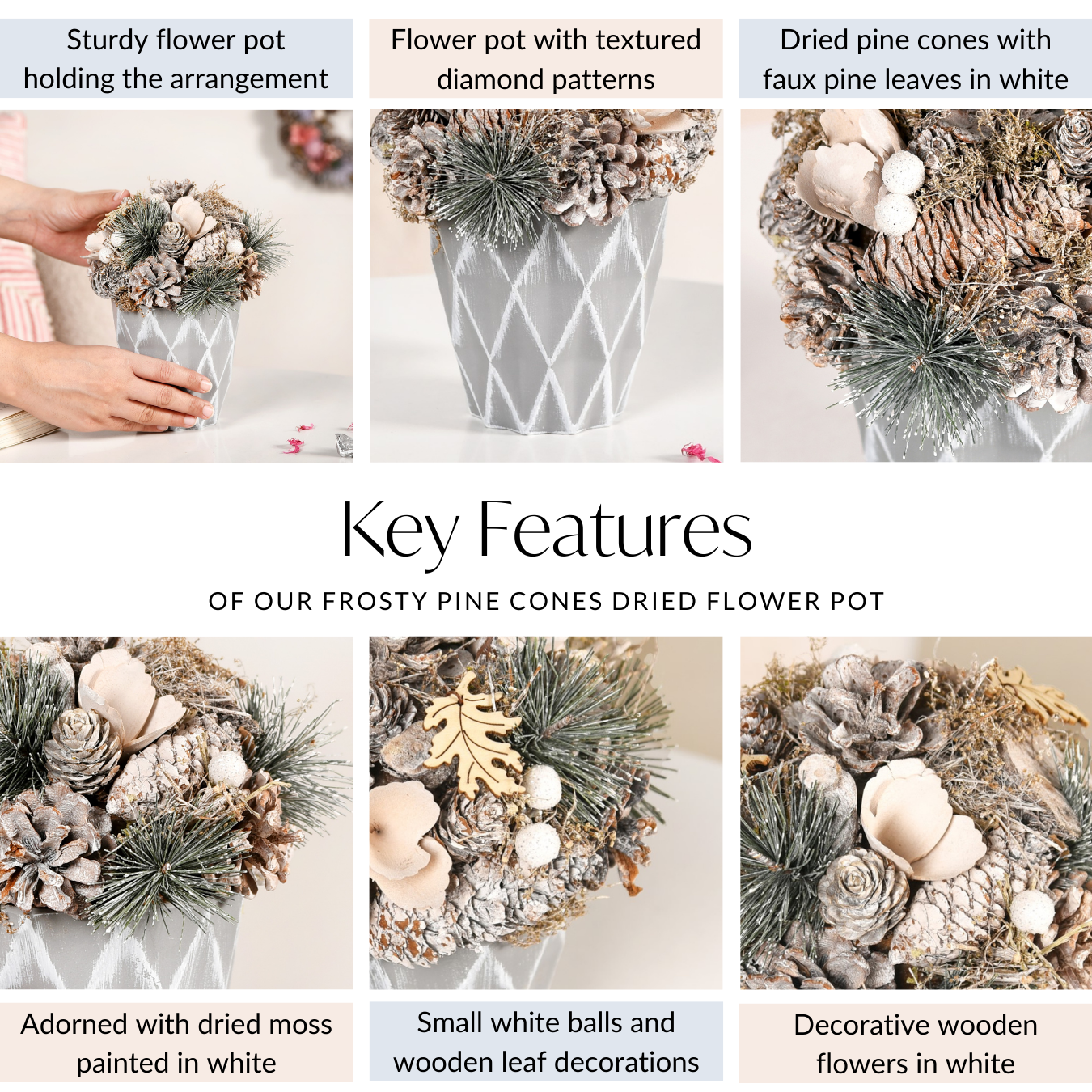 Design: The flower pot features an elegant textured diamond pattern, giving it a sophisticated look that complements any Christmas display. It is adorned with dried pine cones, faux pine leaves in white, and small white balls, creating a wintery, woodland-inspired aesthetic. Wooden leaf decorations and decorative wooden flowers in white add a rustic charm to the overall arrangement, enhancing the seasonal appeal.