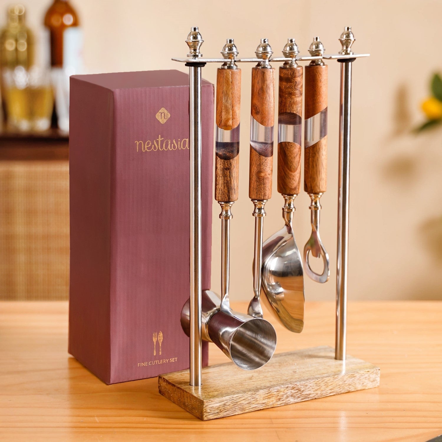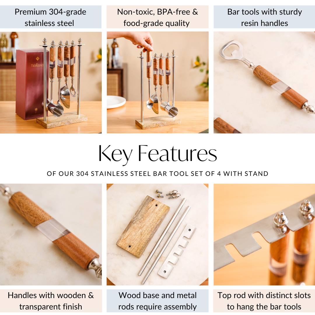Fusion Wood Resin SS Bar Tool Set Of 4 With Stand