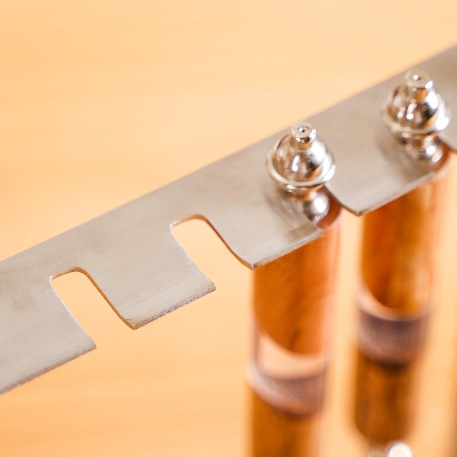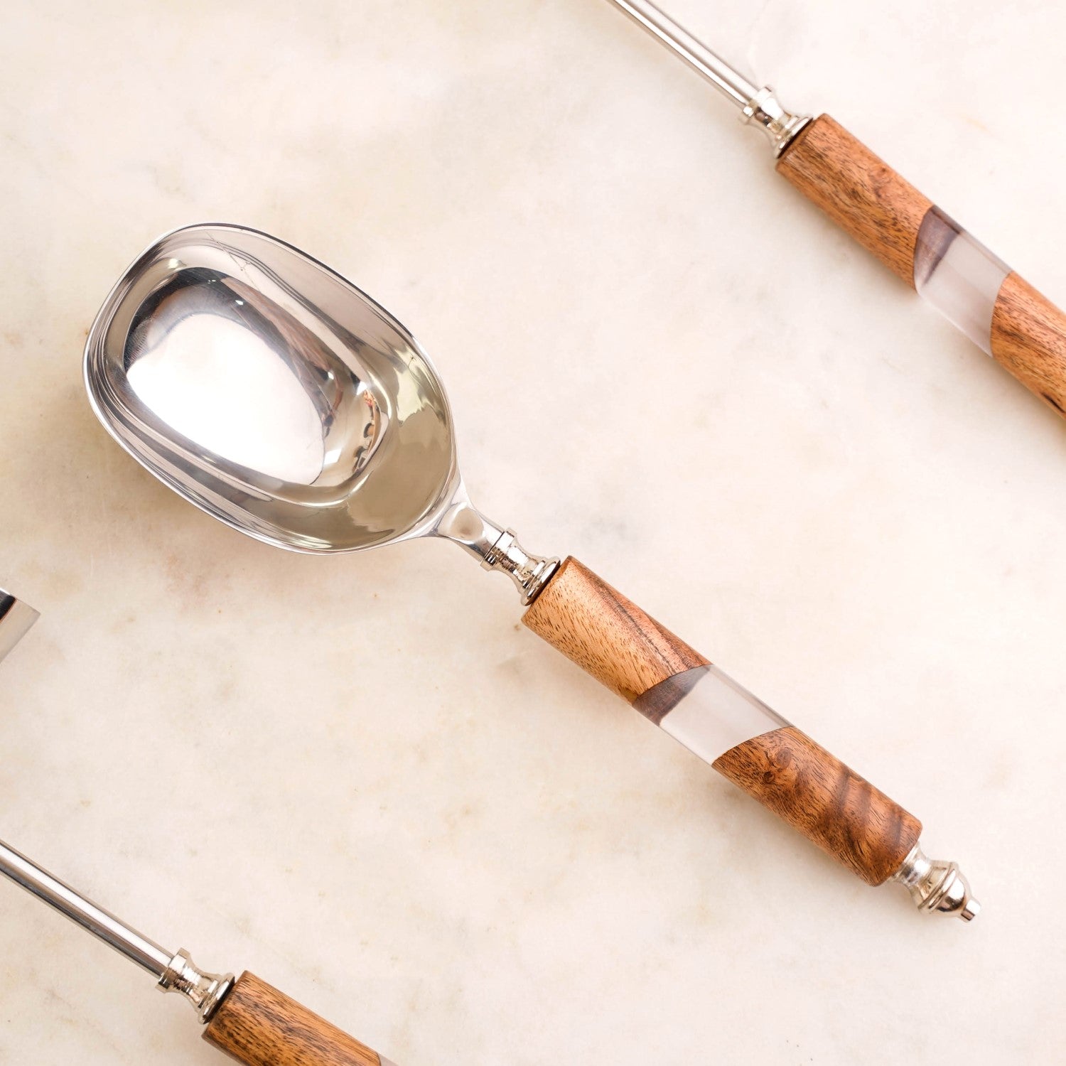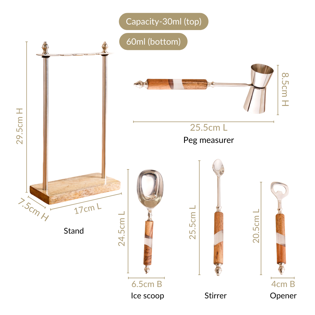 Design: The bar tools feature an eye-catching blend of wood and transparency on the resin handles, adding a modern rustic touch to your setup. The mango wood stand enhances the aesthetic with its natural grain and warm tones, while the metal rods and distinct slots on the top rod make it easy to hang and access each tool. With a sleek, compact design, this set complements any decor while saving counter space.