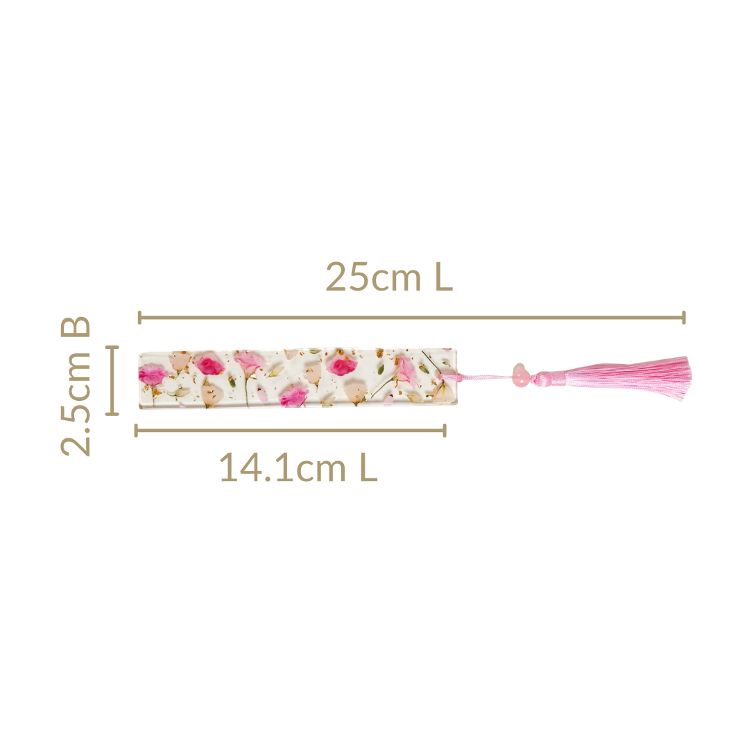 A handcrafted resin bookmark is the perfect companion for every good story. Designed to bring a smile to your face, this flower bookmark features delicate garden roses in shades of pink and white. The scattered gold flakes add a shimmery touch of luxury that beautifully complements the roses' elegance. Adding a playful pop of colour, a satin tassel in a charming bubblegum pink hue dangles elegantly, making it easy to locate where you left off. So, what are you waiting for? Mark your place in style and let this bookmarker make your reading moments extra special.