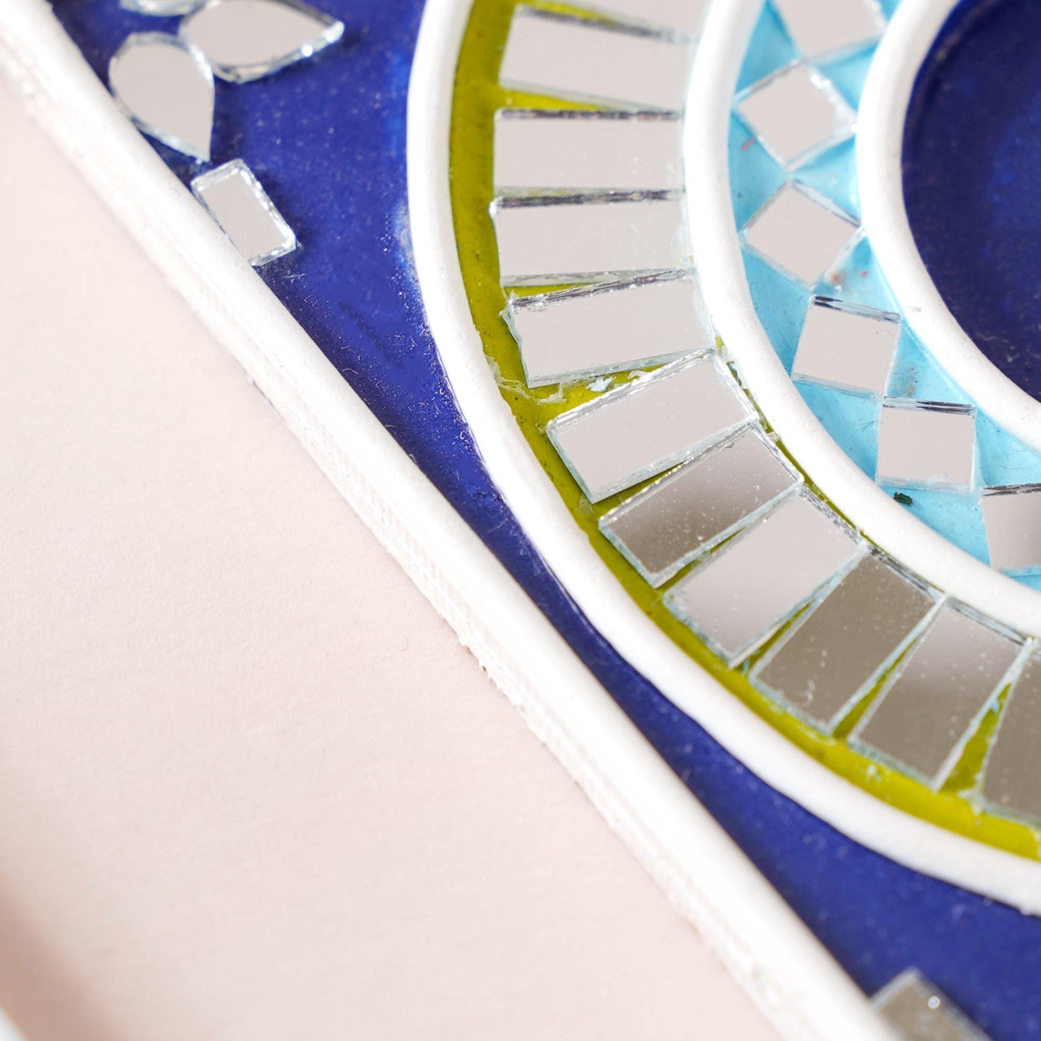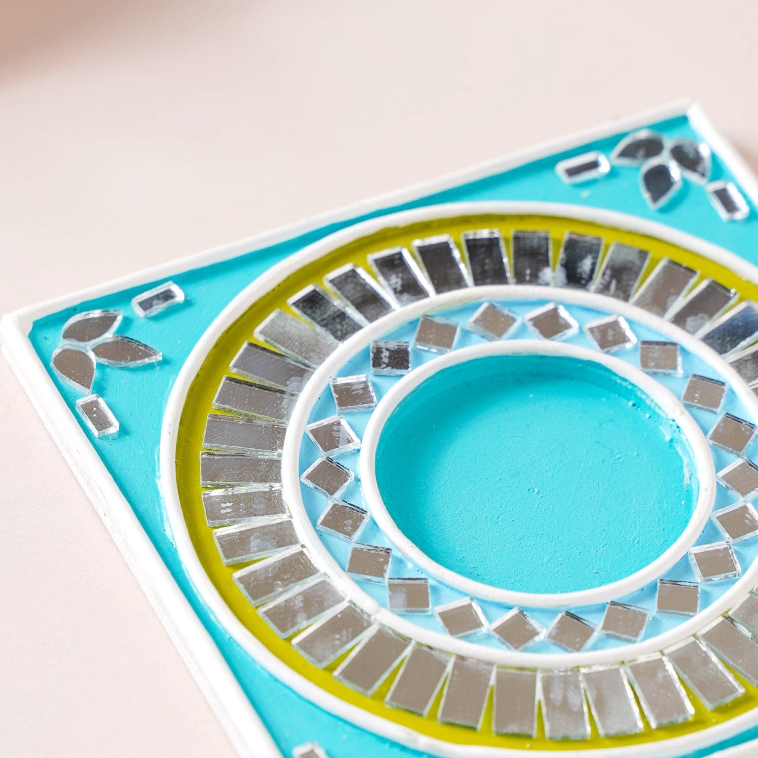 Design: This dynamic candle holder set features four square tealight holders, each showcasing the vibrant interplay of geometric patterns and vibrant colours through Lippan art. One tealight holder features a striking colour combination of turquoise, light green, and light blue, creating a refreshing and energetic vibe. On the other candle holder, a chic and captivating combination of different shades of blue with a touch of light green offers a bold and sophisticated contrast. Both holders incorporate intricate geometric shapes, reflecting the essence of contemporary design while maintaining the charm of traditional craftsmanship. The mirrored details of the Lippan art ensure that they catch the light of your tealight candles, brightening their glow, and ultimately your space.