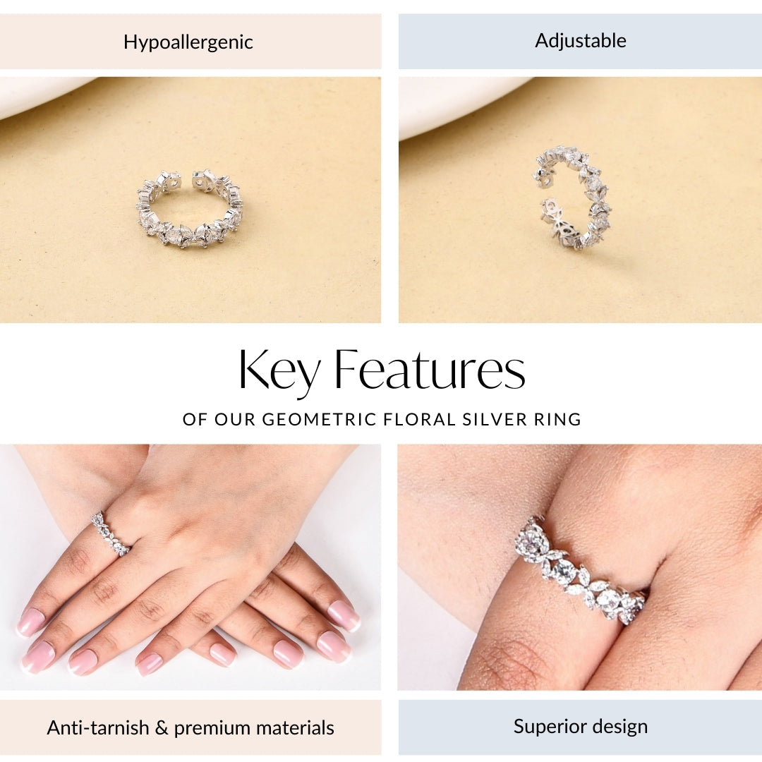 This silver ring is all about effortless elegance. With its thick band, dainty four-petal flowers, and shimmering stones, it’s the perfect mix of bold and delicate. The iridescent finish catches the light beautifully, making it a stunning pick for everyday wear or special occasions. Plus, it’s adjustable—so no size worries! Whether you’re treating yourself or picking out a thoughtful gift, this dainty ring is a timeless addition to any jewellery collection.