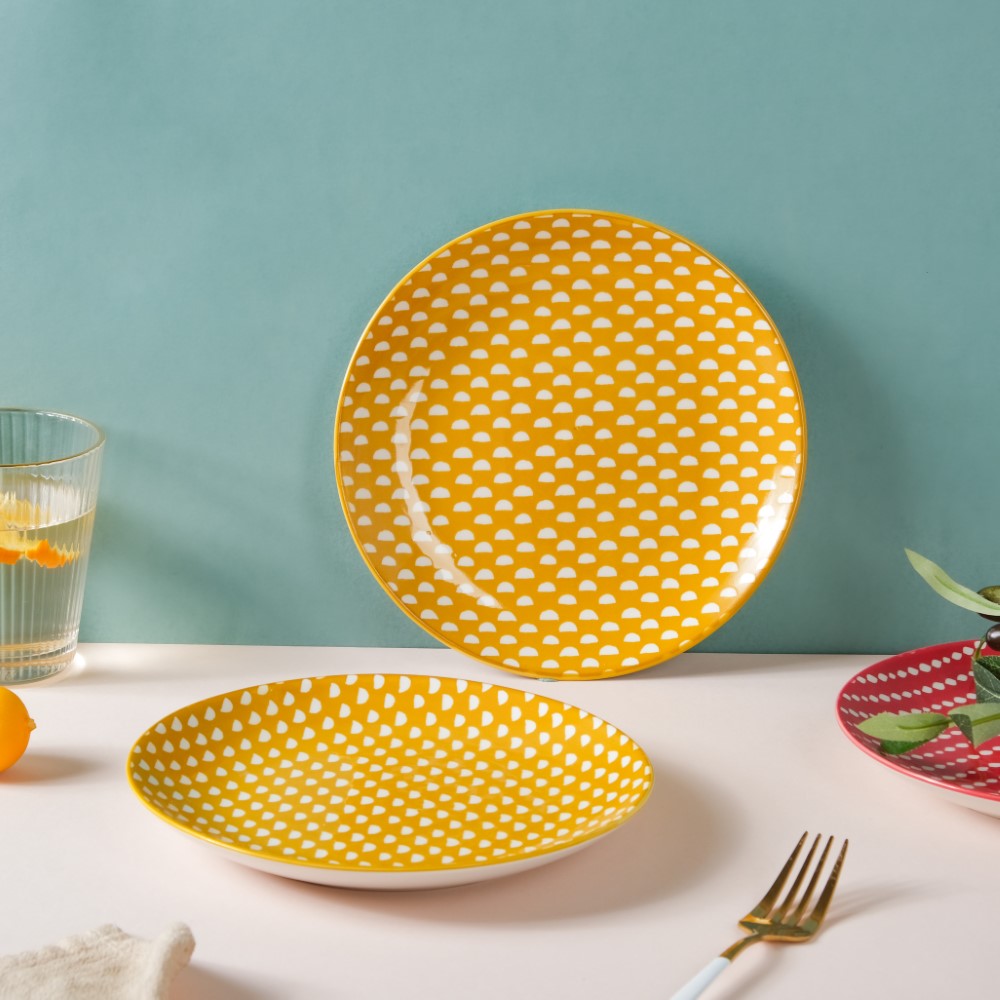 The snack plate set comes in an attractive mustard yellow colour adorned with cute, little, white semi-circles all over the top surface. The ceramic snack plate set is perfect for serving quick evening snacks or appetisers while hosting a dinner party. So, the ceramic dishware set can easily double as a ceramic serving platter for snacks and appetisers. Not to mention, the unique semicircular patterns on the ceramic plate set make it a better table decor item than ordinary small plates for appetisers.