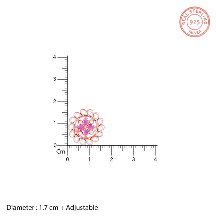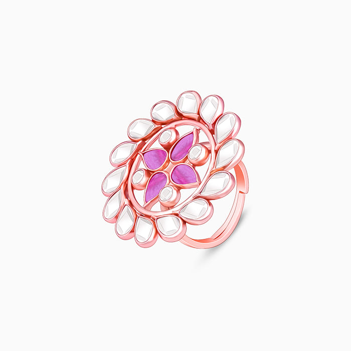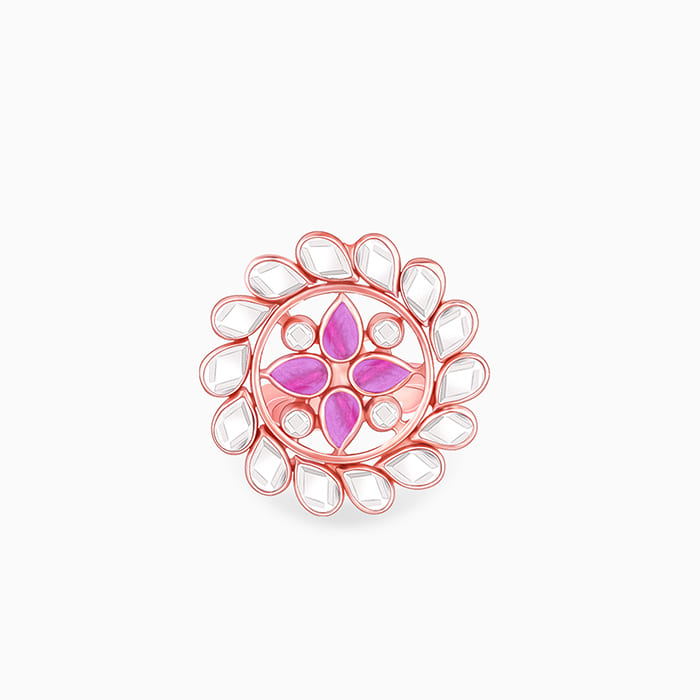 This rose gold ring has a flower motif studded with rose-cut glass stones and coloured stones. Presenting Trendy Freak's chic #VivaahDaSwag Collection for an unforgettable wedding.