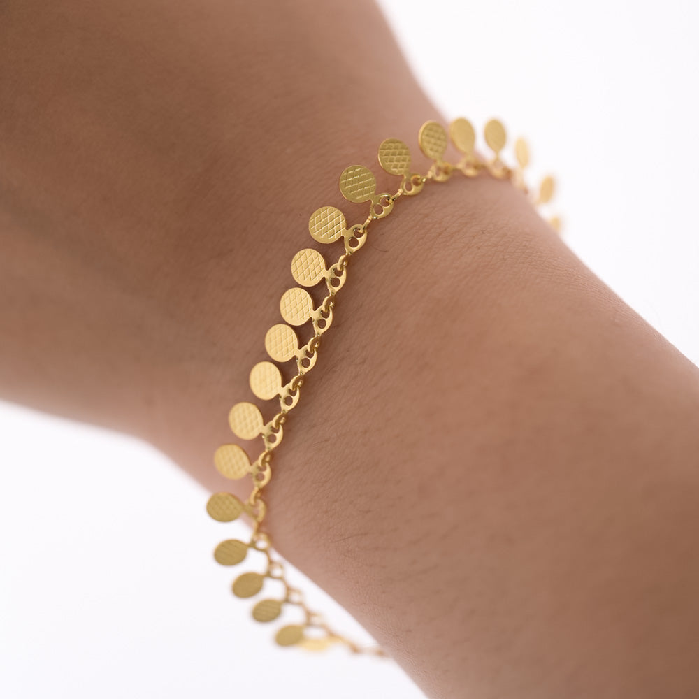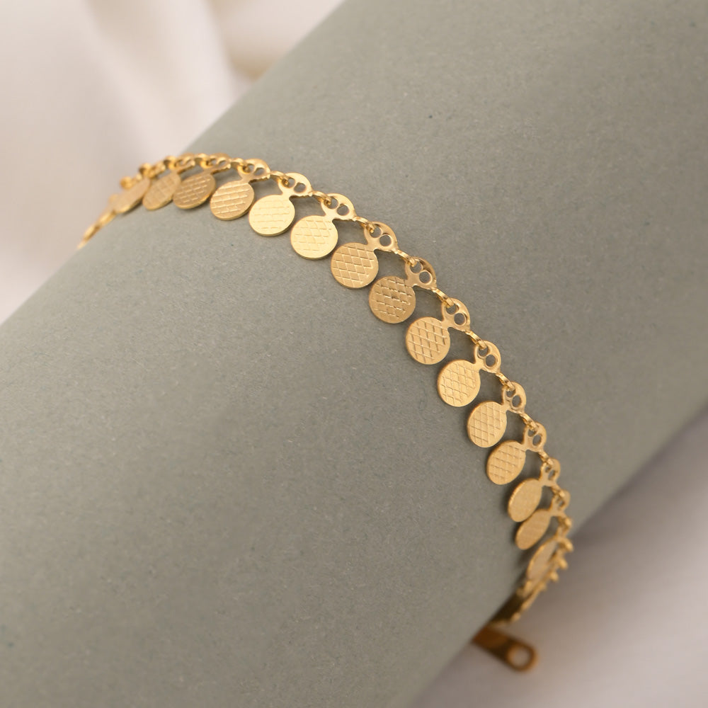 This captivating accessory is adorned with an array of coin-like charms, intricately arranged around the bracelet to create a mesmerizing cascade of vintage elegance. Each charm boasts meticulous detailing, evoking the charm of bygone eras and distant lands. The coin-like charms carry a sense of timeless symbolism, echoing prosperity, luck, and the rich stories of the past. Crafted with precision and plated in 18k gold, this bracelet adds a touch of opulence to your ensemble. The rhythmic jingle of the coin charms creates an auditory tapestry that accompanies your every movement, enhancing the overall sensory experience of this unique piece.