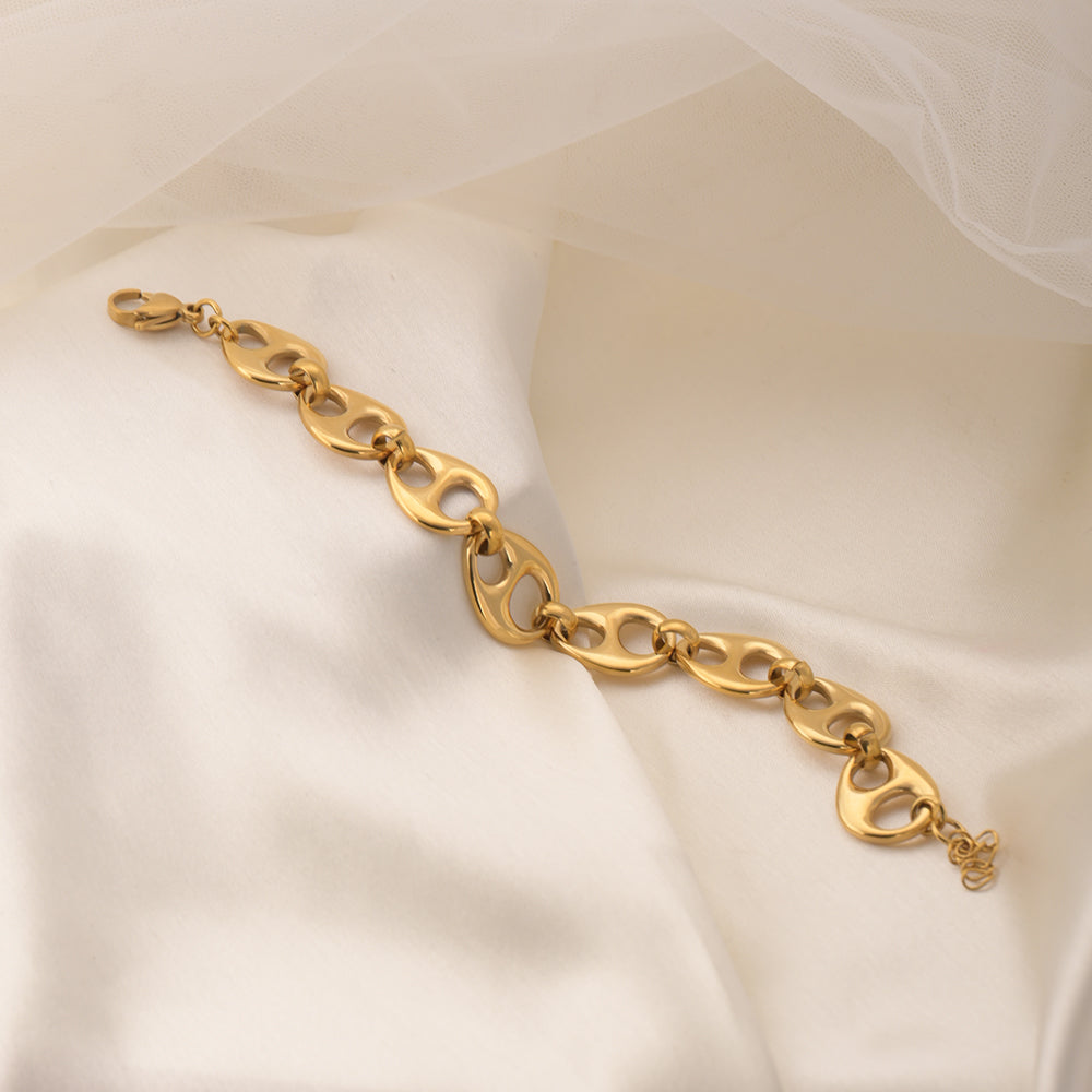 Unity Gold Linked Bracelet, a dazzling focal point in our latest jewelry collection. This exquisitely crafted piece seamlessly merges classic allure with a modern aesthetic. Each gold link is made with precision and sophistication, creating a unique accessory that effortlessly elevates any ensemble. The Gilded Unity bracelet is not just an adornment; it's a symbol of interconnected elegance. Make a statement with this radiant addition to your jewelry collection, embodying the perfect contemporary style.