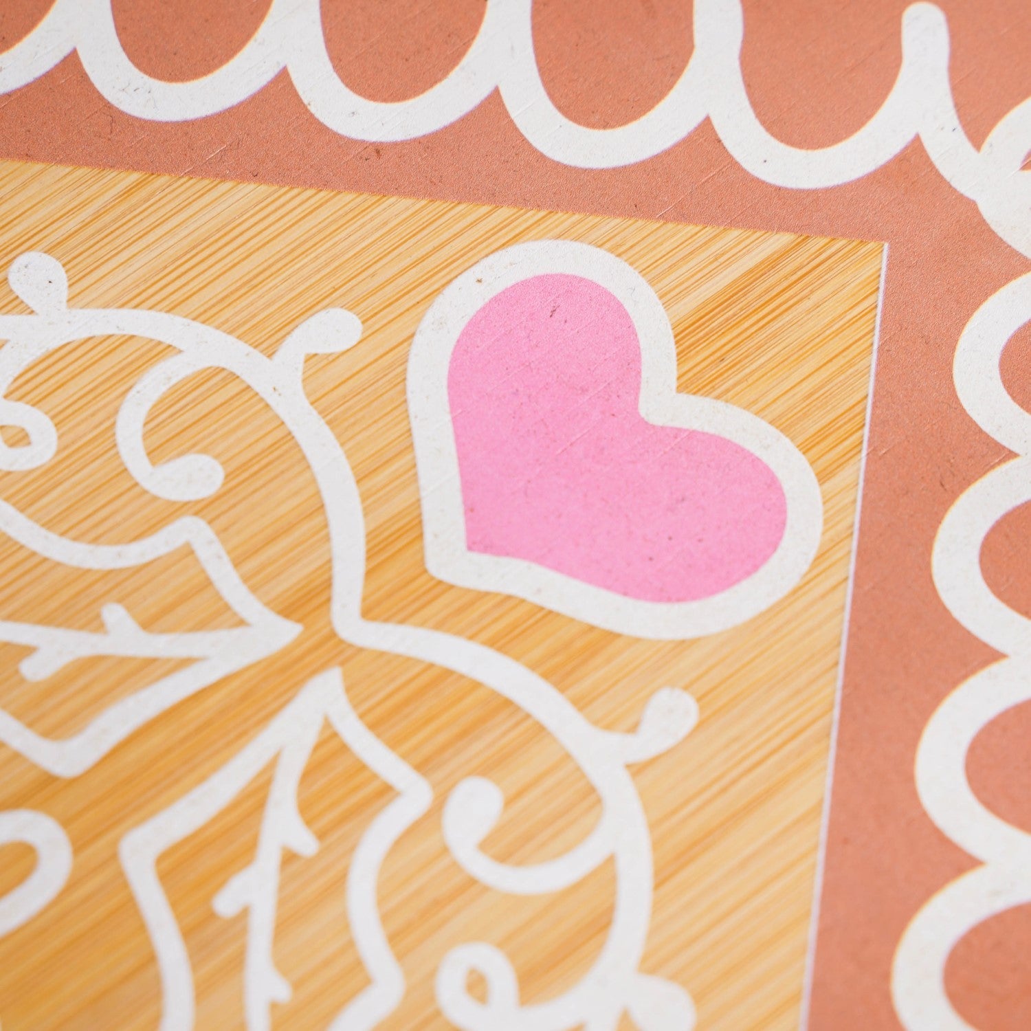 Design: Add Christmas vibes to your kitchen with this adorable gingerbread house-shaped bamboo platter tray. Crafted from eco-friendly bamboo, it features intricate printed detailing in white and pink to mimic icing, complete with windows, a heart, and decorative swirls. The natural wood grain adds warmth, while the sturdy build makes it perfect for serving snacks, displaying treats, or as holiday décor. Its house-shaped silhouette with rounded corners and scalloped edges brings whimsical joy to any space. Lightweight, durable, and easy to clean, this tray is both functional and delightful for seasonal use or gifting. For long-lasting use, wipe with a damp cloth and let it air dry.