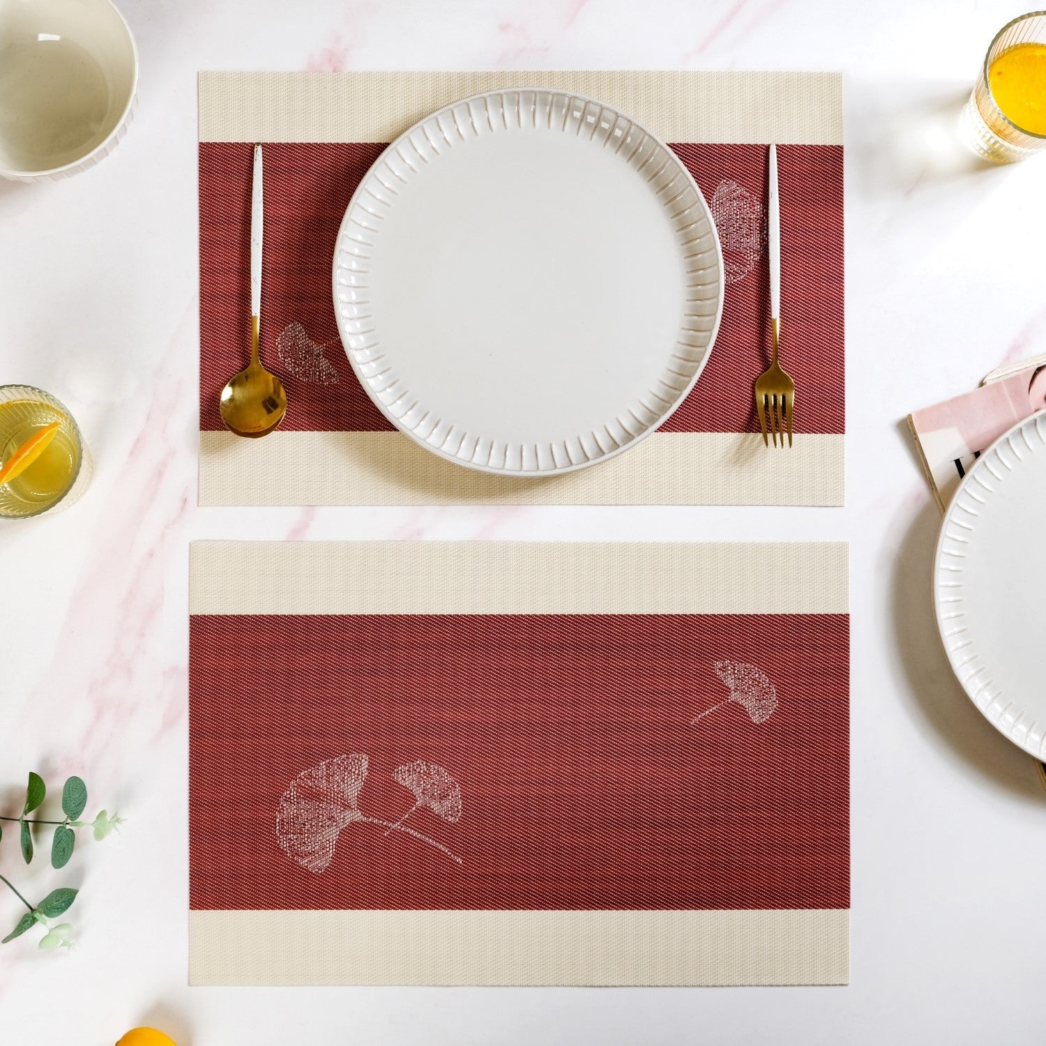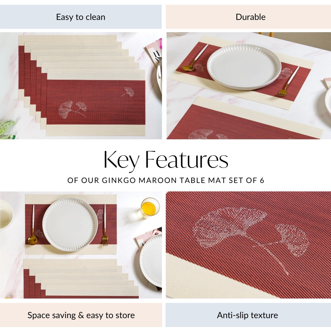 Design: This dinner table mat set brings a pop of colour and geometric flair to any dining space. Crafted from high-quality PVC, these dining table mats are not only durable but also easy to maintain. The textured surface offers superior grip to prevent slipping, making them a practical choice for any table setting. Each set includes six placemats, providing ample coverage for larger tables. The gingko design woven onto the set adds a flair on your dinner table.
