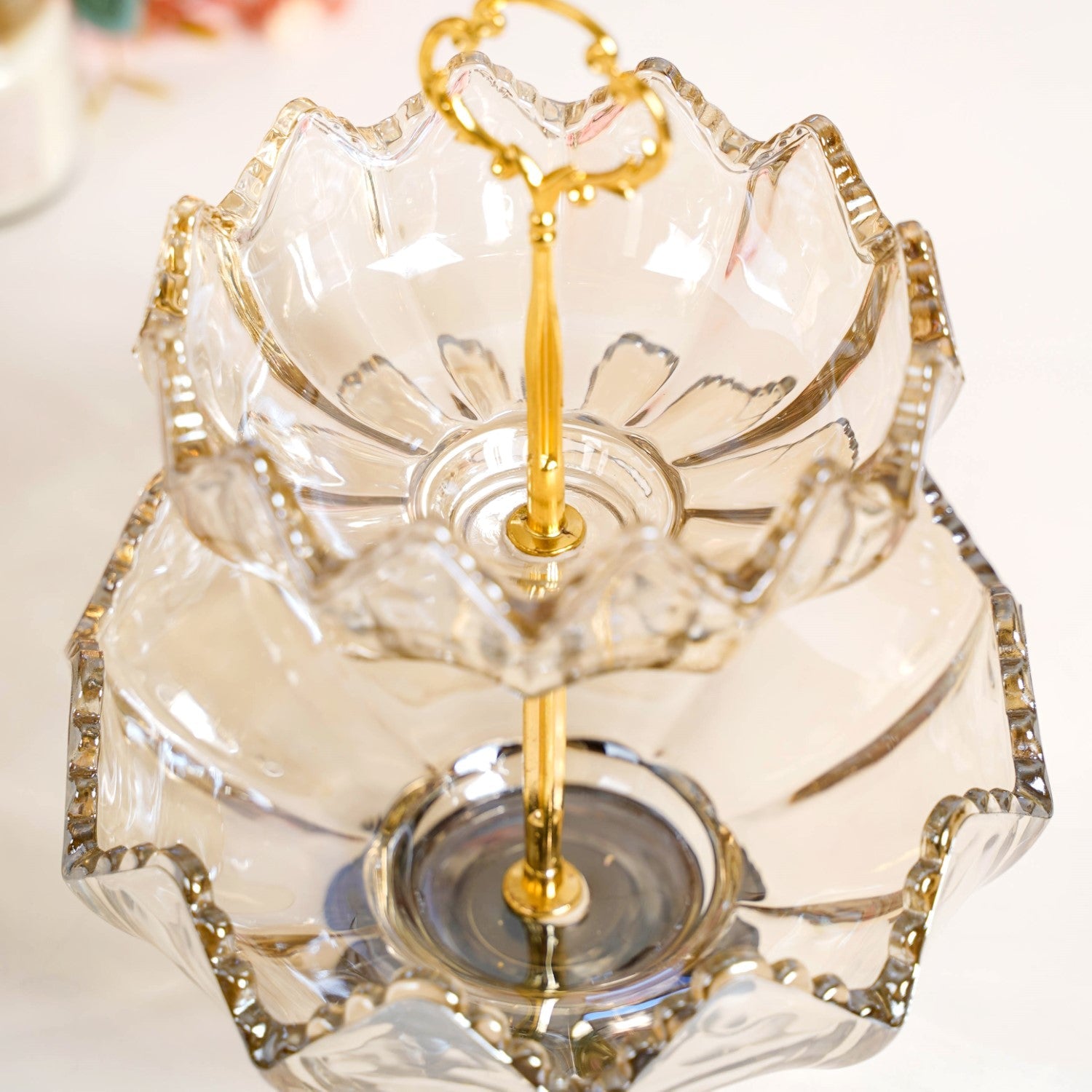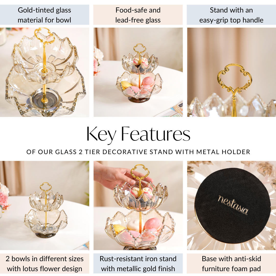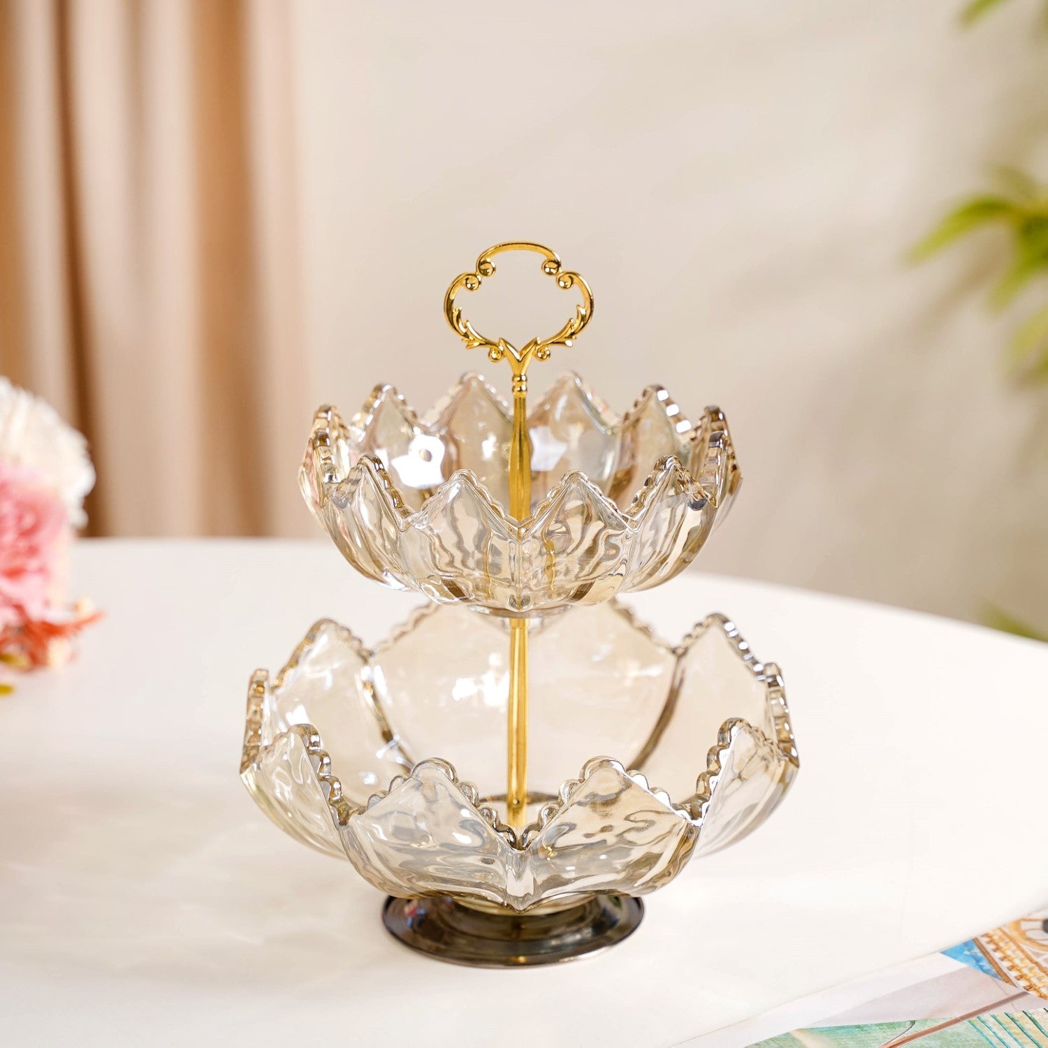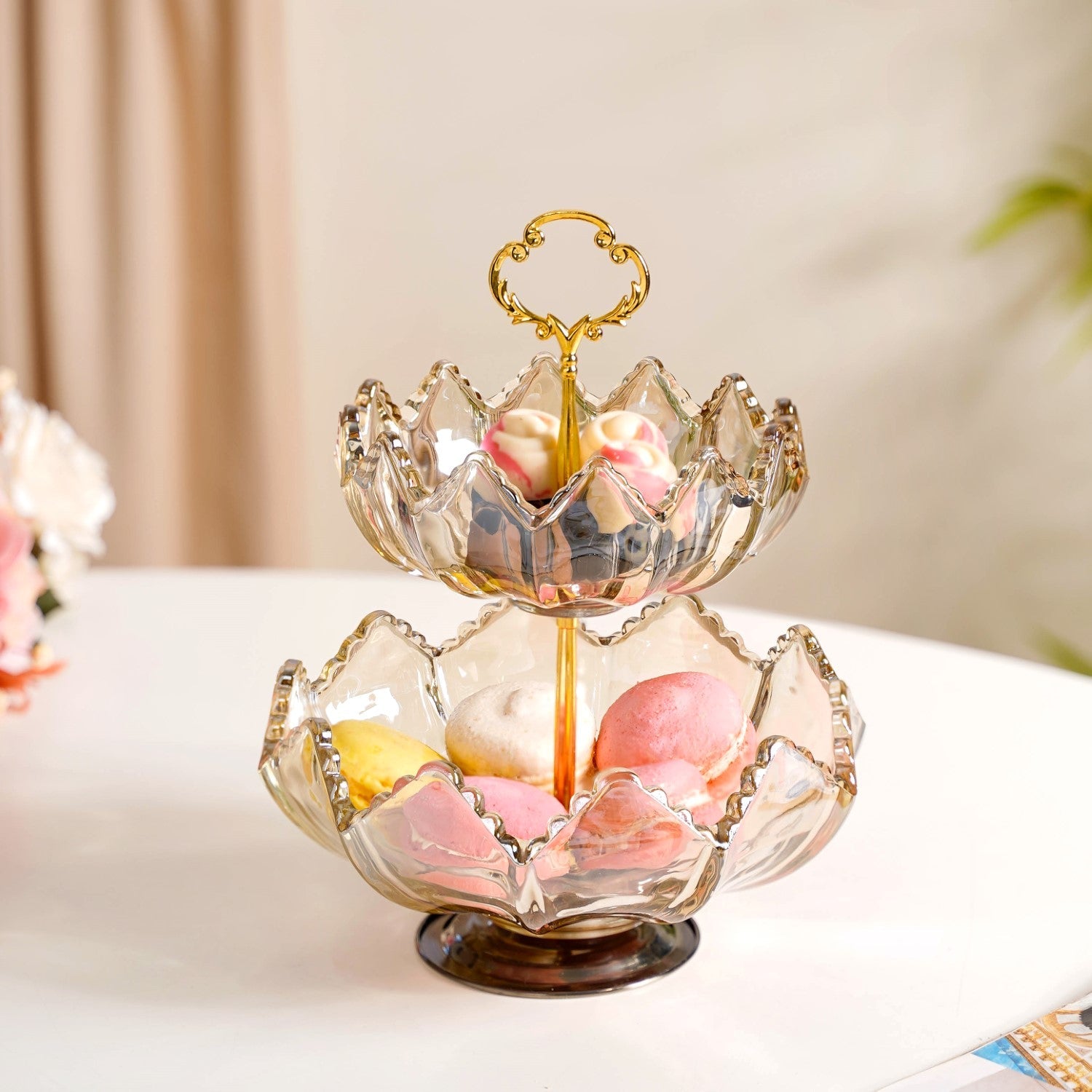 Design: This cupcake stand features two bowls in varying sizes, each boasting a blooming lotus flower shape, adding a floral touch to your table setting. The stand boasts an easy-grip top handle, ensuring effortless transport, and is finished with a rust-resistant iron stand in a stunning metallic gold hue. The base is equipped with an anti-skid furniture foam pad to keep it securely in place.