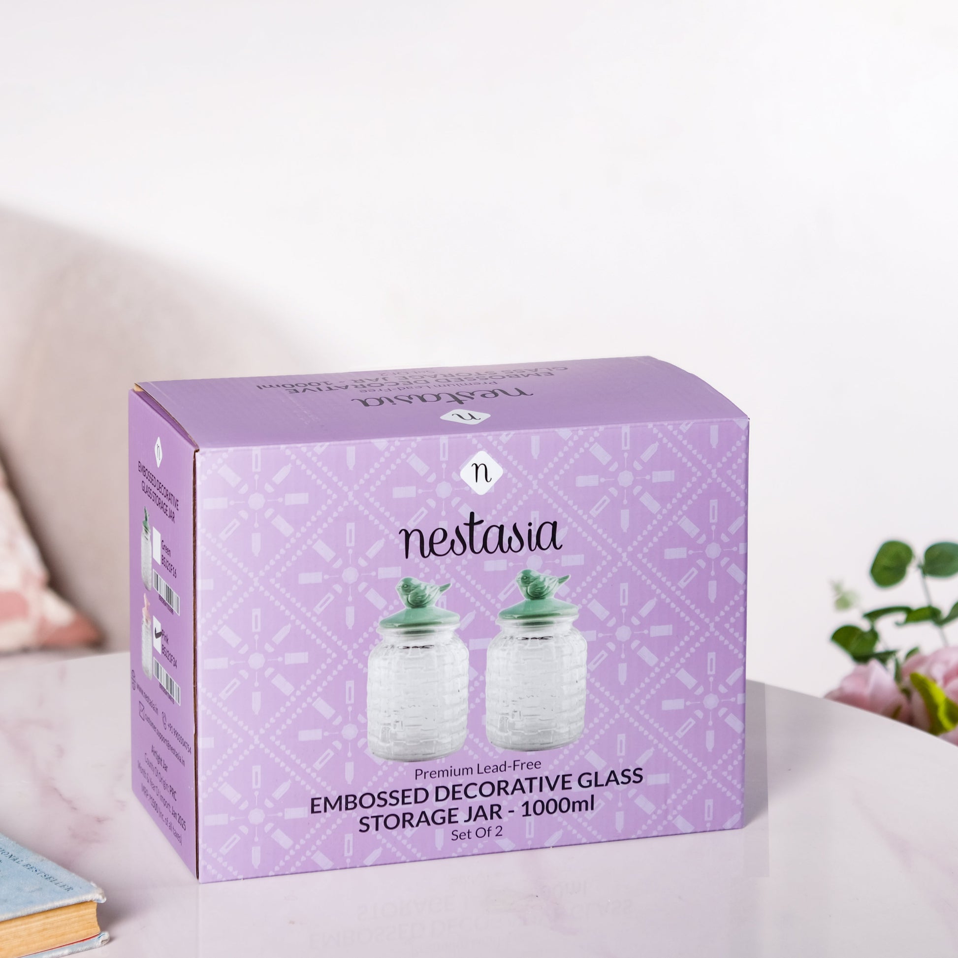 Design: This elegant glass jar showcases a cylindrical body with a charming basket-weave texture, adding a touch of vintage flair to any space. It comes with a ceramic lid in a soft green hue, topped with a delicate bird-shaped knob in the same colour. The lid fits snugly and features a Polypropylene gasket, ensuring an airtight seal. Both functional and decorative, this jar is perfect for stylish storage in your kitchen, bathroom, or living area. The jars come in a beautifully designed gift box.