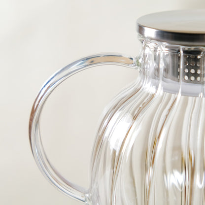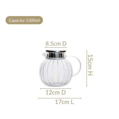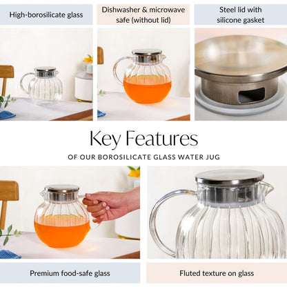 Design: Crafted with broad vertical ribbed patterns, the jug has a stylish wavy mouth and sleek ridges inside. The spout is neatly integrated into the borosilicate body, with a steel lid featuring strainer holes and a precise pouring slot. A silicon gasket ensures a tight seal while the glass handle offers a sturdy grip. Its compact shape makes it easy to store on open shelves or inside your fridge.
