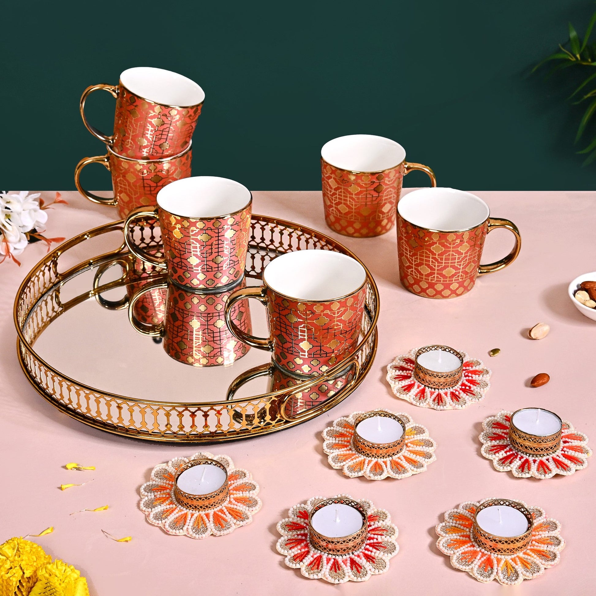 Add sparkle to the Diwali celebrations with our exquisite gift hamper, featuring a decorative tray, a set of six ceramic mugs, and a set of six stunning tealight holders. The tray showcases an intricate rim design with a metallic gold finish and a crystal-clear mirror base, perfect for elevating any occasion.