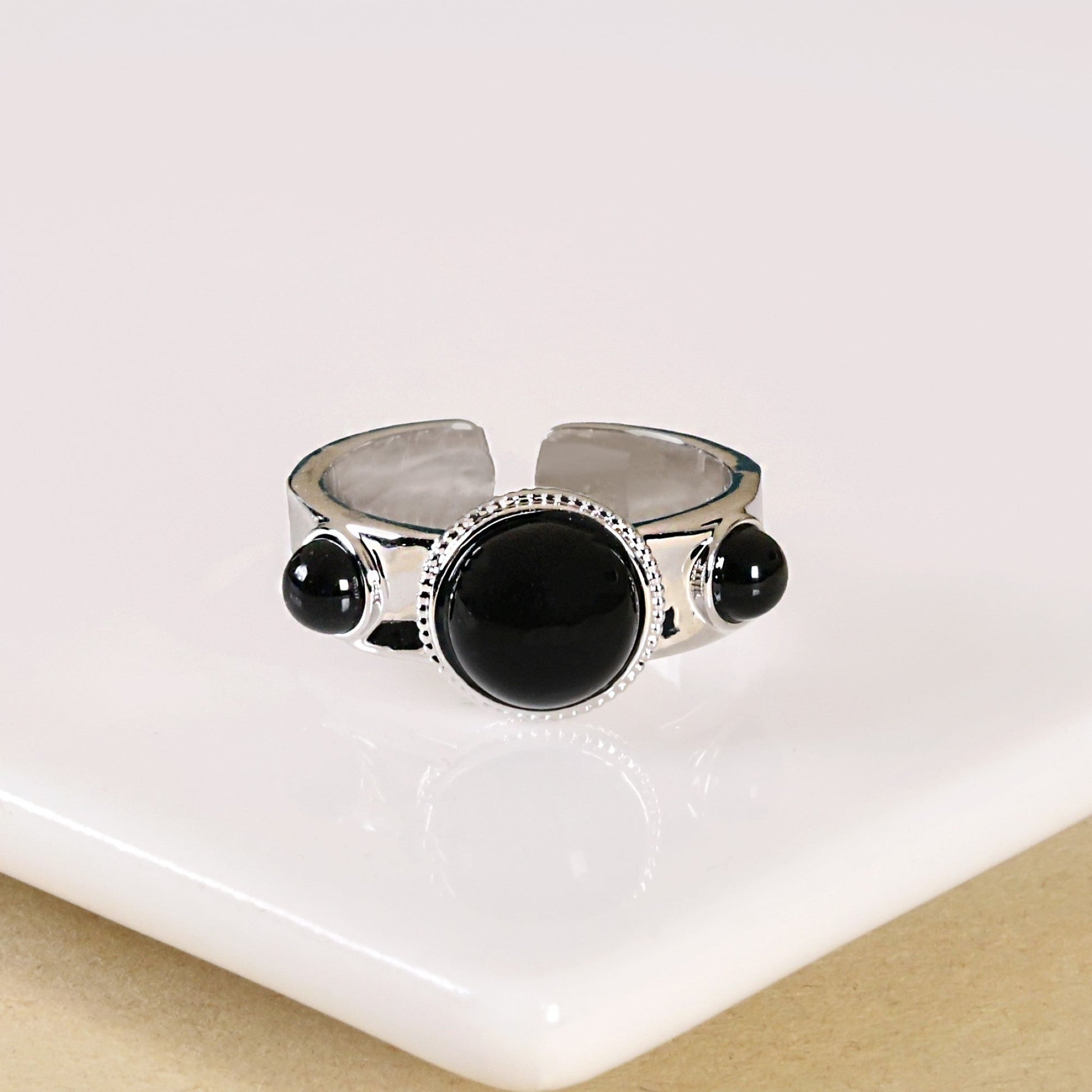 Bold, mysterious, and effortlessly chic—this silver-toned metal ring is where modern elegance meets organic charm. Featuring three striking pitch-black resin beads that mimic the depth and beauty of natural gemstones, this piece is pure sophistication. The larger center bead draws attention with its rich, inky allure, while the two smaller side beads create a perfect sense of balance. Set against a textured silver band, this ring is a fusion of the edgy and the timeless, making it the perfect statement piece for those who love a touch of drama in their style.