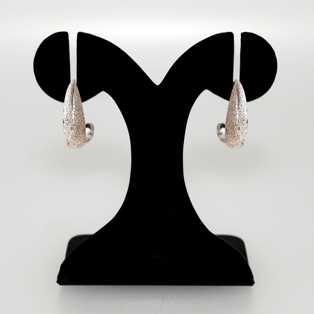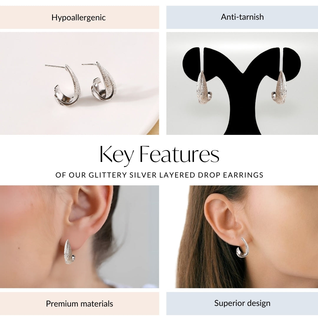 Bring an effortless sparkle to your attire with these stunning silver drop earrings. Crafted from high-quality metal with a shimmering glitter finish, they reflect light with every movement, adding a radiant touch to your look. The design features two separate structures that gently overlap at the end, creating a seamless and graceful flow.