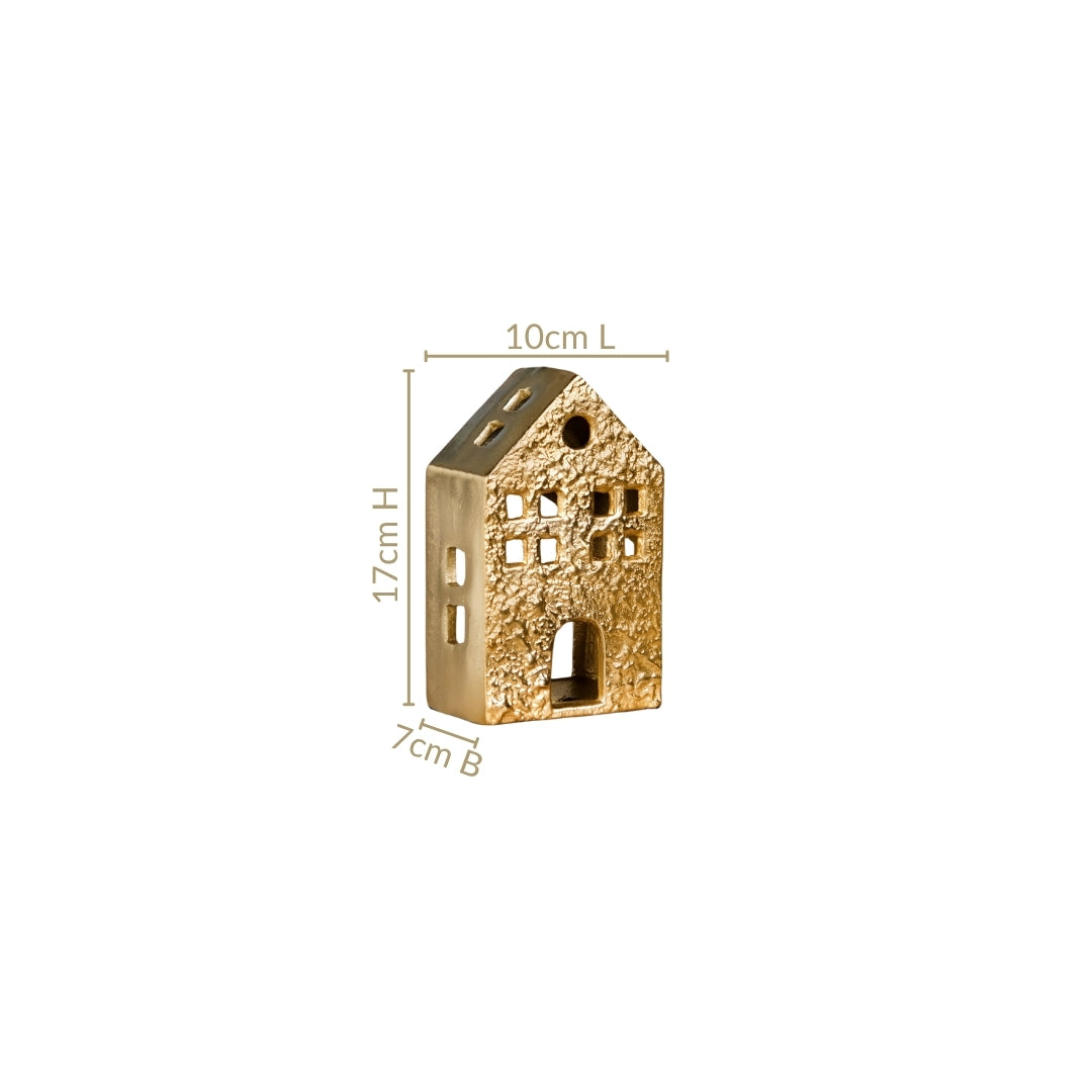 Design: Made of sturdy aluminium, this candle holder is designed in the shape of a tiny house. It features plenty of carved windows that let the candlelight shine through and allow airflow. The hammered texture on the outside gives it a handcrafted, rustic charm. A bright gold finish makes it stand out on any shelf or tabletop. The base has anti-skid pads so it stays in place without leaving scratches. There's also a gate-style back and front that keeps the tea light securely inside.